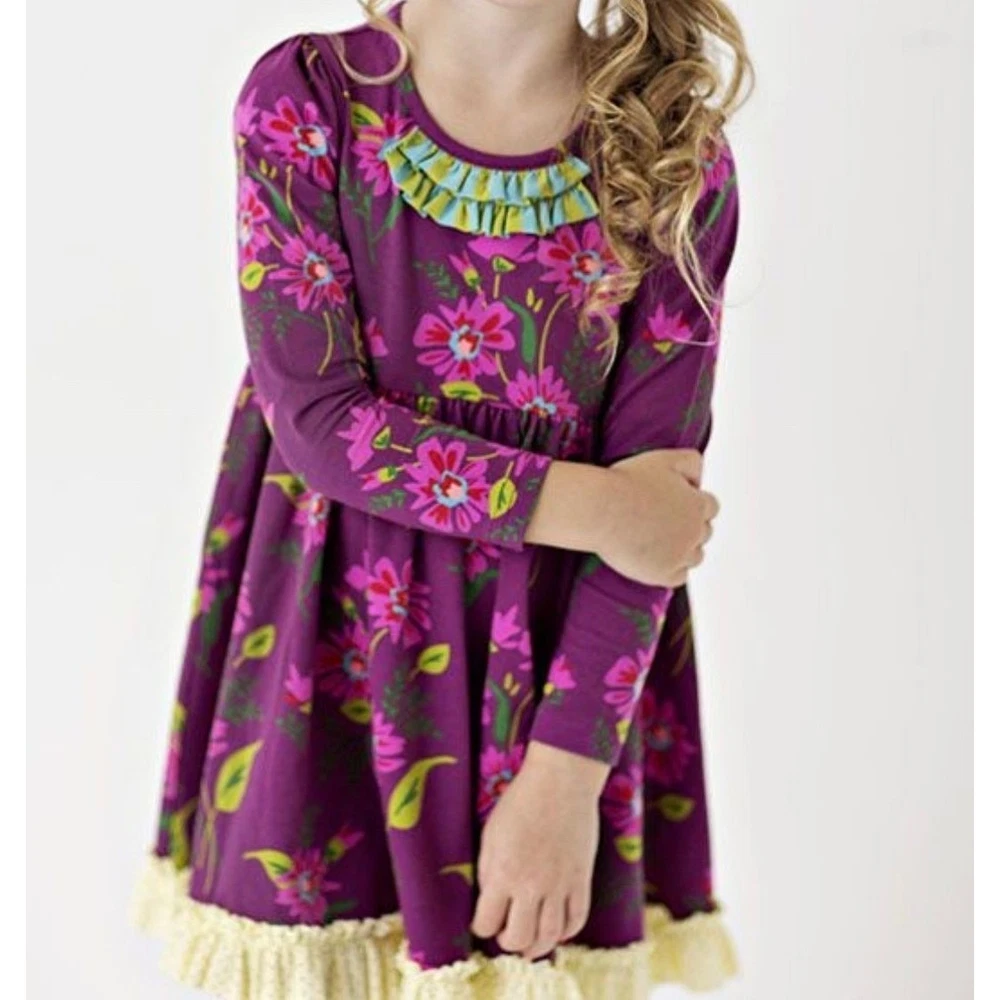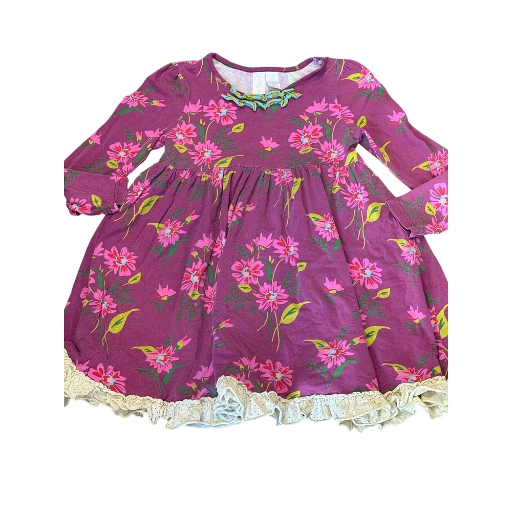 Adorable and classic Matilda Jane “Blossom Lap Dress” from the Paint by Numbers Fall 2013 collection. Features a rich plum background with bright floral print in pink and lime green, accented by a ruffled aqua-and-chartreuse neckline and cream polka-dot hem trim. Size: 6 Condition: Good used condition — normal wash wear consistent with age, no holes or stains noted. Please note this is from 2013, not a new dress. Fabric: 95% cotton, 5% spandex (soft knit stretch) Care: Machine wash cold, line dry Details: Long sleeve, swingy A-line silhouette, ruffle trim, floral print From the Paint by Numbers collection — a beloved, hard-to-find classic!