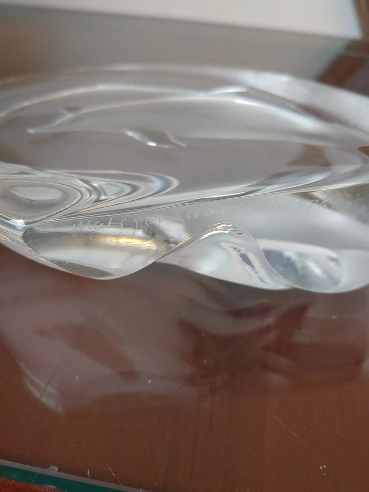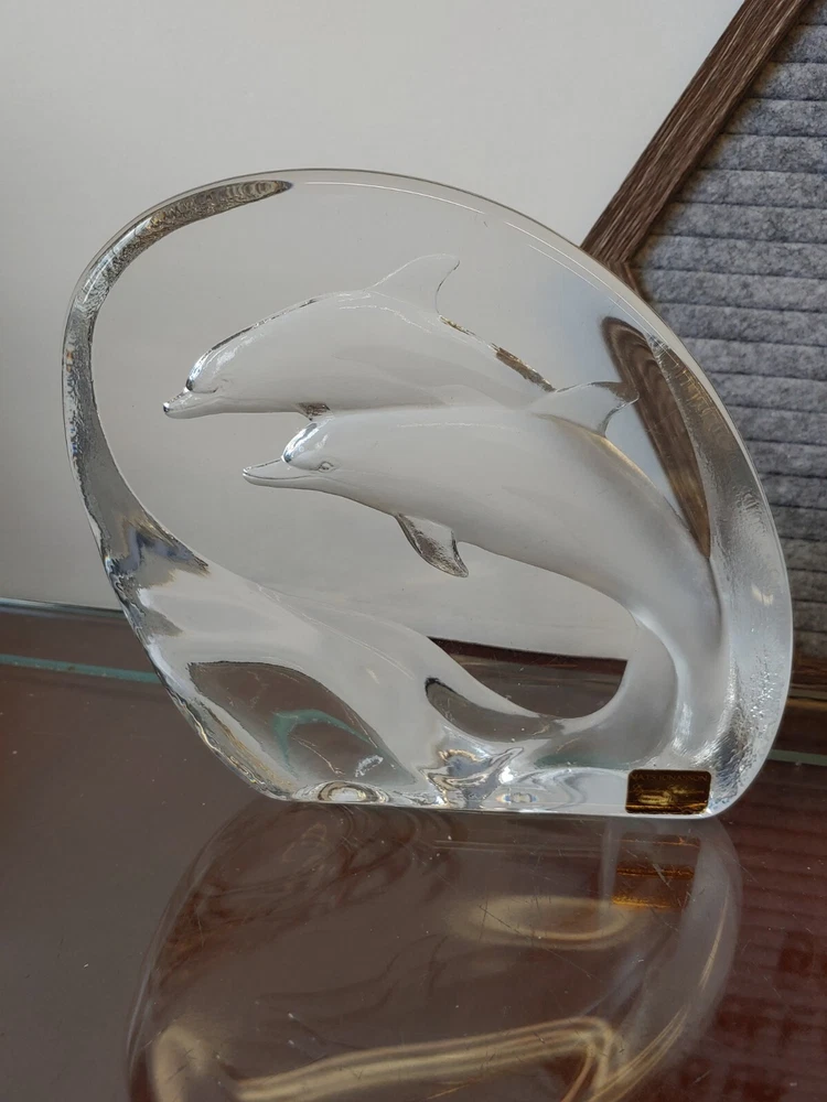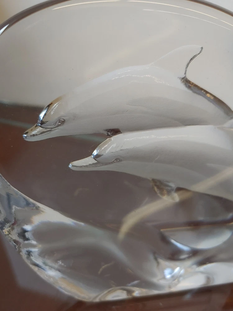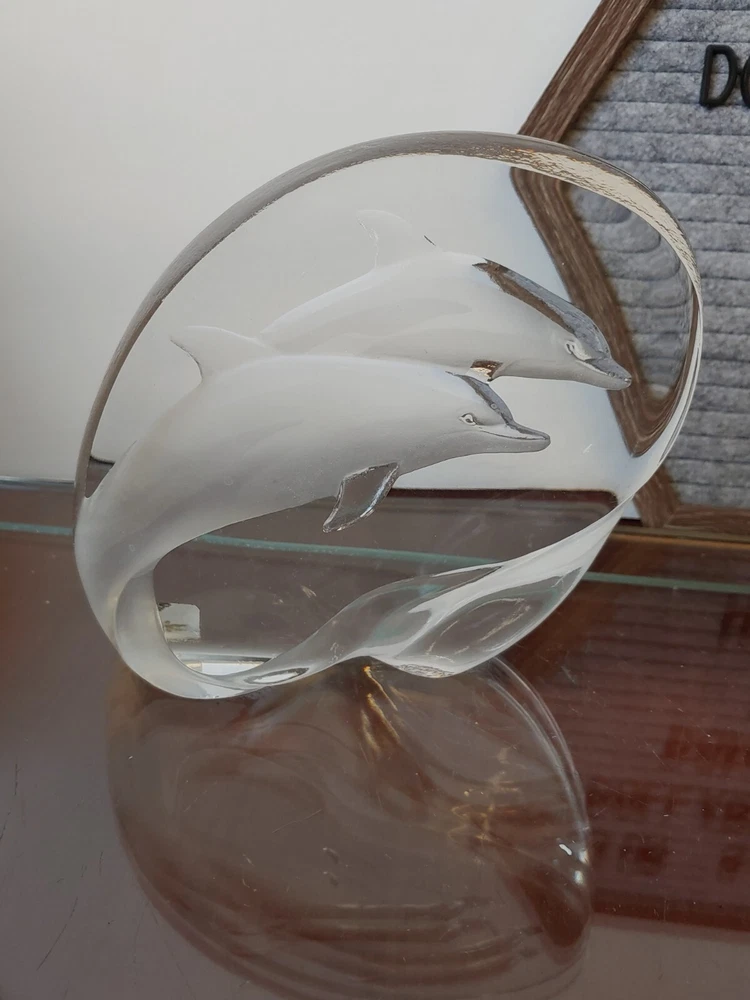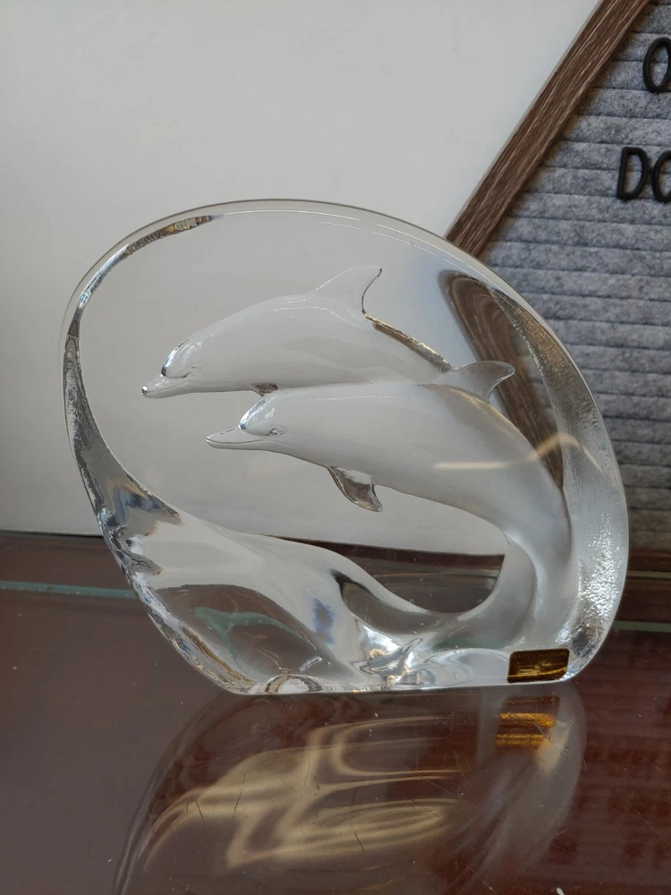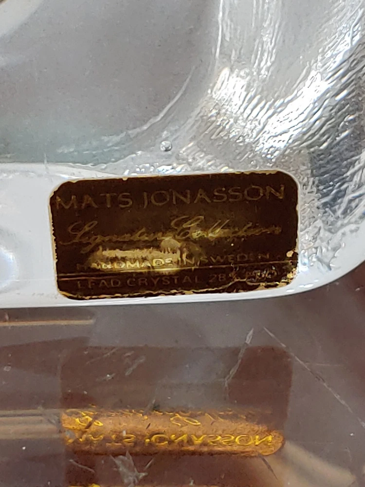 Mats Jonasson Sweden Dolphins Porpoise Etched Signed Full Lead Crystal Sculpture Pre-owned. 5.75" height 6.25" wide 1.5" thickness A couple of small scratches on the front. All proceeds benefit patients in hospice care.