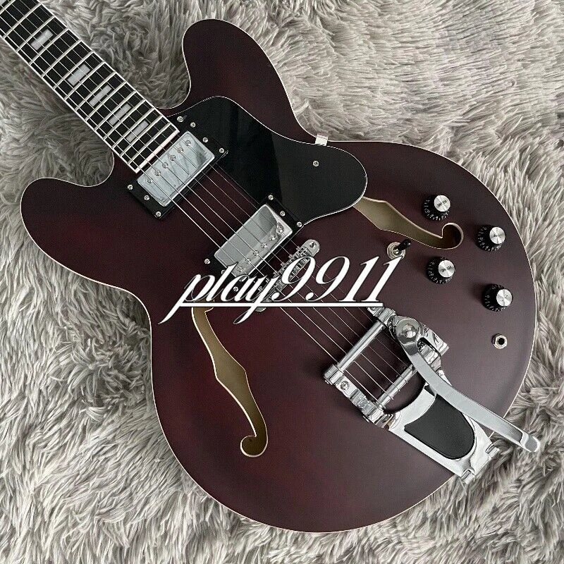 Factory Matt Reddish Brown ES-335 Big Vibrato Bridge Electric Guitar Hollow Body Welcome to my store. My team has been making musical instruments for many years. I will try my best to provide the best item for you! Goods condition Body:Mahogany Neck: Mahogany Fingerboard: Black Nut width: 42 mm Scale Length:24.7 inch Joint:Bolt on Hardware:Chrome Pickups:2 Humbuckers Pickup Switch:3-ways Electronic:2 Volume 2 Tone Bridge: Big Vibrato Bridge ABOUT THE PICTU RES The pictures are taken in our factories by ourselves. Each guitar is different from others because of the light in room or some other reasons .So there are maybe some differences between the pictures and the guitar you get. Every guitar cannot be the same in 100%, the pictures of the guitar that you see is just one of them. If you want some details about the guitar, please contact me. OUR GUARAN TEE We test every guitar (such as buzzing, sound test, workmanship) is in good condition before it is shipped out. When you receive the guitar, if you meet some problems like readjustment the strings or you are not happy with our guitar, please let me know immediately and we will try our best to meet you satisfaction. CUSTOMIZED CEN TER Head stocks are not pictured per our policy. Custom Head stocks are available upon request from our factory custom shop. Please contact us for details. All customized products are non-returnable. SHIPPIN G Once payment has been confirmed, your item will be shipped within 3 or 30 business working days. That depends on specific goods deliver ways.The speed also base on Custom Clearance Speed, which we can't control .So if you want this for your gig next weekend it probably wont make it on time, so please keep that in mind when ordering. PACKI NG We use the carton which is designed for the International transport to package the products you ordered. And we can guarantee the items will not be damaged in the way of transportation. RETURN POLI CY If the item you received is broken or defective, please contact me immediately and return it within 3 days after you received it with the original or approved packaging. After we received it, we will give you a Full-Refund or Exchange. Buyers are responsible for return shopping costs. If you want to replace it, we will send a new one to you and then forward a shipping label. For missing or replacement parts(from the original order), we will ship them to you. Please read the RETURN POLICY before you order it! FEEDBAC K Thank you for your great comments and feedback. (a) When you are satisfied with your purchase, we sincerely hope that you can give us a positive feedback. Again, we will give you a positive feedback. (b) If you are dissatisfied with your purchase, please contact us submitting a neutral or negative feedback. We will respond to you in 24 hours and work with you until you are satisfied.