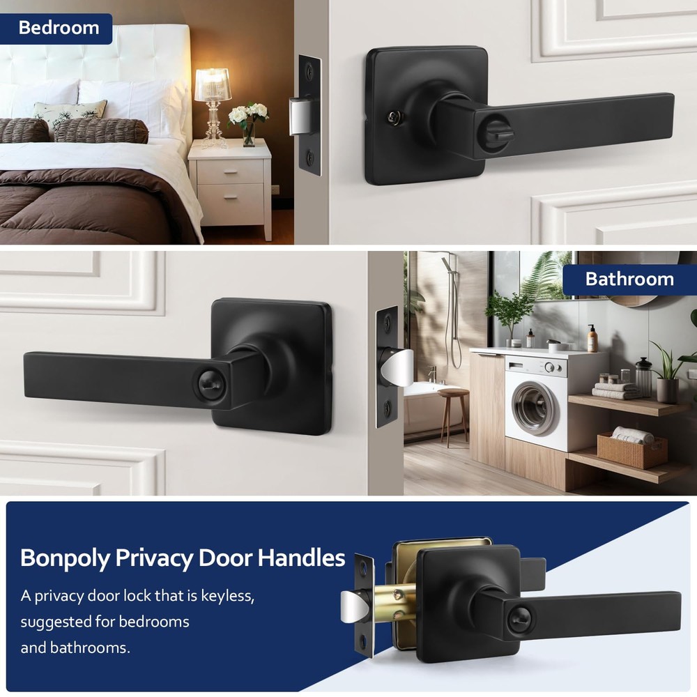 Privacy Door Handle: This door handle is keyless, you can easily enter by pressing the handle down; Meanwhile, it can be locked from the inside to provide you with your own private space; If there is an emergency that someone is locked inside, you can use a flat object, like a coin, to put it into the groove and rotate it to open the door from the outside; Recommended for bathrooms, bedrooms and anywhere you require privacy Sturdy and Durable: Our door handle is made of high-quality zinc alloy, which is both sturdy and durable, so you don't have to worry about a short use life or the handle breaking easily; The thick electroplated coating also makes it impossible to scratch easily; Besides, it is waterproof and rust-free, making it works for a long time even in humid environments; There is no doubt that it is a great choice for your daily use Matte Black Finish: This door handle is square in design and features a matte black finish; Understated yet elegant, it will fit in well with the modern-style room door and add a solid and simple touch to your home Convenient & Adjustable: Please refer to the instructions for installation, you can install it successfully with just a screwdriver; In addition, our latch can be adjusted between 2 3/8 inches (60 mm) to 2 3/4 inches (70 mm) from the edge and fit doors from 1 3/8 inch (35 mm) to 1 3/4 inch (45 mm) thick; To avoid your inconvenience, please measure the basic size of your door before purchasing Satisfactory Service: We not only provide good products, but also serve you wholeheartedly; Whether you have pre-sale inquiries or after-sale problems, please feel free to contact us, we are always here to help you