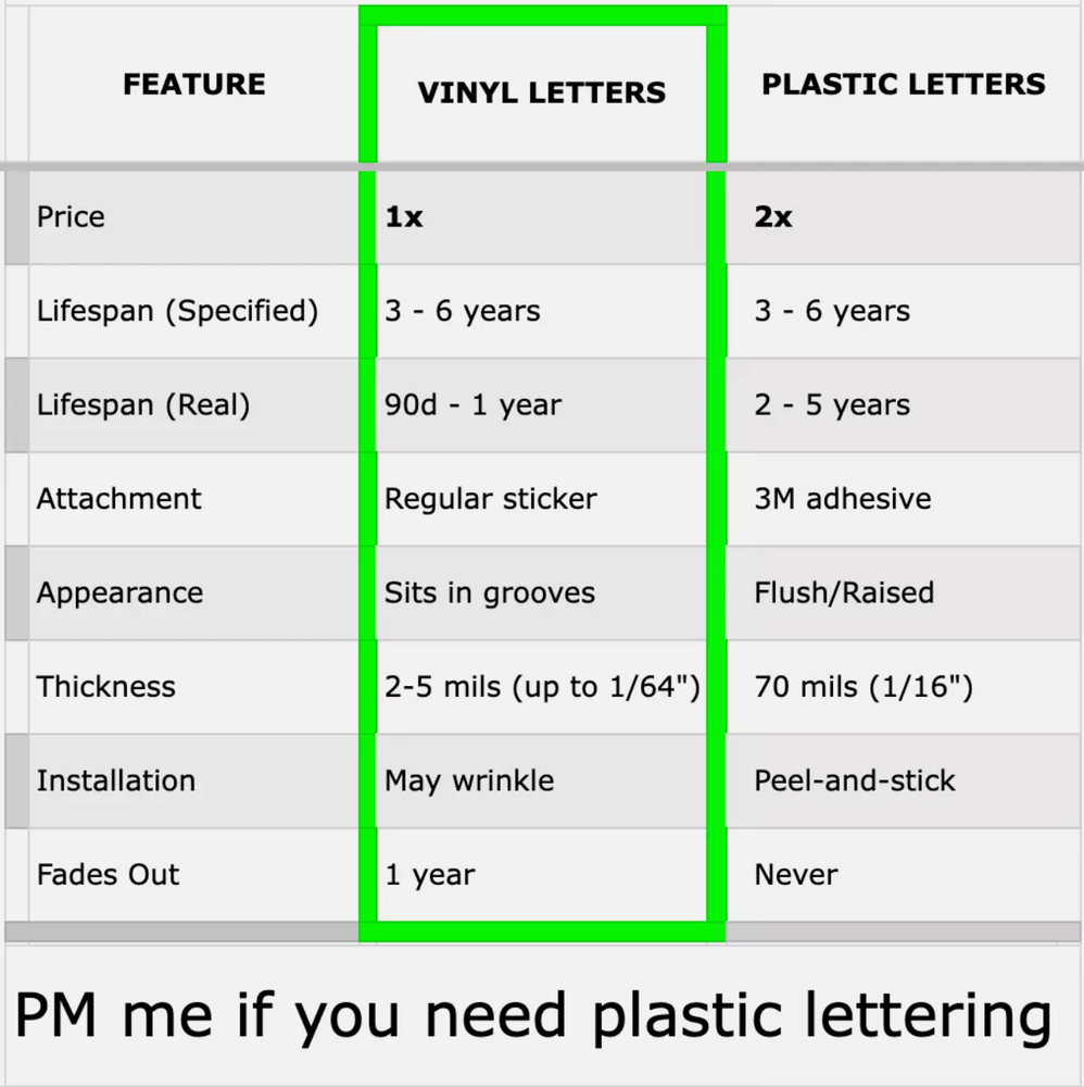 Great product, great seller. Lettering was exactly as advertised and expected, packaged nicely, shipped quickly, and came with everything needed for installation. Application was a breeze with a perfect fit. Looking forward to my next purchase.