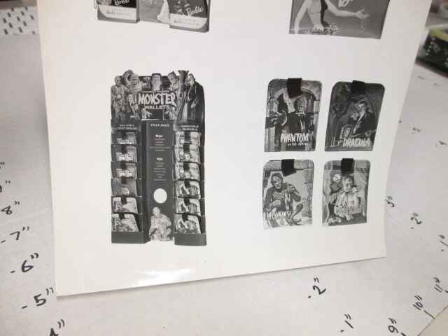 ITEM DESCRIPTION Mattel SPP 1960s sales photo vinyl wallet display Mummy Wolfman Barbie Dracula $285.00 From the files of a professional photographer who did work for the Mattel subsidiary called Standard Plastic Products or SPP. This company made vinyl wallets, lunch boxes, binders, pencil cases and other items. Many of these items are very rare today. This is an ORIGINAL photo that appears to have been used to create sales sheets, catalog use or for salesman use. Excellent or better condition unless indicated otherwise---some faint creases. Most photos are approximately 8 x 10" ---see the inch marks in the photo. NOTE--I do not think the Universal Monster wallet display has ever been seen ! OFFERS ---I list 20,000+ items a month on EBAY. It is easier to put Best Offer on everything but because I lose 15% to EBAY fees no matter what, I may not be willing to take offers on everything I have listed. COMBINED SHIPPING ? YES...I can do this but ONLY If you follow the below instructions. To be clear, "combined shipping" is when you buy 3 items, for example, each with a shipping charge of $8, but since I can ship all 3 in the same box, you get charged $10-12 instead of $24. I cannot "combine shipping" after you have already paid. 1) DO NOT USE the cel phone app ! If you do, EBAY will force immediate payment and charge you full shipping on each item. I will not refund your money if this happens. 2) You must log into EBAY with a browser (Chrome, Safari etc) on your phone, computer or laptop to avoid this. 3) Put all items in your Cart and then, while in your Cart, click the "Request Total" link. "Request Total" will not be visible if you click "Checkout" under your Cart icon. You must click "View Cart" under your Cart icon. The URL should say cart.ebay.com Because EBAY and PAYPAL have made partial refunds so complicated, I will no longer be refunding $ if you do not follow these instructions. MY PHOTOS - If more than 1 item is shown in a photo--- then items are in SEPARATE listings unless otherwise stated ! Read description! PAYMENT-General Info PAYMENTS- USA Various payment options will show during checkout. Contact me if you need another payment option. EBAY is charging sales tax. Sellers have no control over that. PAYMENT-FOREIGN ORDERS Various payment options will show during checkout. Contact me if you need another payment option. SHIPPING COST ? .... see "SHIPPING COSTS : Shipping-Foreign" (shown below). CUSTOMS CHARGES -- your country may charge you customs fees before you can receive the package. This is not my responsibility NOR is it part of my shipping charge. It is a fee charged by the country you live in. SHIPPING COSTS SHIPPING-USA FIXED SHIPPING RATE = actual shipping cost & insurance & small handling fee ($2 or less). West Coast may be significantly higher on larger or heavier items. FYI here is what the US Post Office currently charges : SHIPPING-FOREIGN For UK, Canada,and Australia , PLEASE check with me first to make sure shipping charges EBAY has listed are correct! In the last few years, there have been HUGE increases in shipping cost outside the USA. The shipping cost listed is usually for FIRST CLASS shipping. The USPS will only insure Priority and Express shipments. ******There is a $2-$5 handling fee for foreign orders. ========================================================= Offered by DAVID WELCH ------ author of COLLECTING PEZ 1995 and Pictorial Guide to Plastic Candy Dispensers 1991. I have been a full time antique and collectibles dealer since 1989 and have been collecting since the early 1970s. I have been on EBAY since 1997. If you have questions about any negatives I have received, feel free to ask. THANK YOU TO THE PATIENT AND REALISTIC PEOPLE WHO MAKE 98% of EBAY DEALINGS A PLEASURE. I have been on EBAY since 1997 and this company's ability to make simple things needlessly difficult is unmatched by anything I have experienced elsewhere. ===================================================================== Powered by SixBit's eCommerce Solution