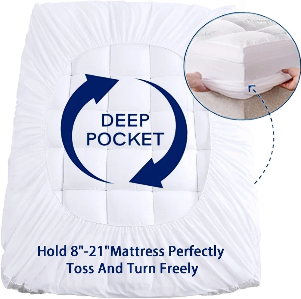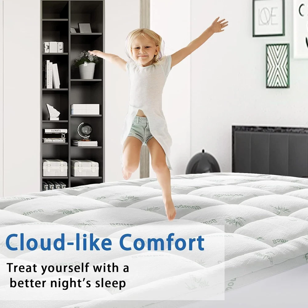 Color White Size Queen Fabric Type 60% Polyester (Soft)+40% Viscose Made from Bamboo (Breathable) Special Feature Cooling, Quilted, Breathable About this item 【 MATTRESS TOPPER】: With 1000GSM of premium fluffy loft, this hotel quality bed topper will transform your mattress from ordinary to unparalleled comfort and supreme softness - while maintaining outstanding support and cushioning. 【COOL & BREATHABLE】: Encased in 40% of the smoothest, silky soft breathable Viscose Made from bamboo fabric, our mattress topper is designed to deliver excellent ventilation and evenly distributes heat to prevent you from feeling hot and sweaty. 【ELASTIC DEEP POCKET FITTED SKIRT】: Our elasticated deep pocket skirt will wrap tightly around your mattress and accommodates depths from 8-21 inches. This clever skirt works exactly like a fitted sheet to ensure your mattress topper will remain securely in place. 【Machine Washable & easy Care】: Be it sweat or stains, you will never get them out of topper or expensive mattress. This mattress topper will take care of them all. If it gets dirty, just throw it into a commercial washing machine, it will come out fluffy and clean after washing and drying. No expensive dry cleaning necessary. Economical and sustainable. Color White Size Queen Fabric Type 60% Polyester (Soft)+40% Viscose Made from Bamboo (Breathable) Special Feature Cooling, Quilted, Breathable Closure Type Pull On Product Care Instructions Machine Wash Water Resistance Level Not Water Resistant Age Range (Description) Adult Material 60% Polyester (Soft)+40% Viscose Made from Bamboo (Breathable) Product Dimensions 80 x 60 x 18 inches Item Weight 9.98 pounds