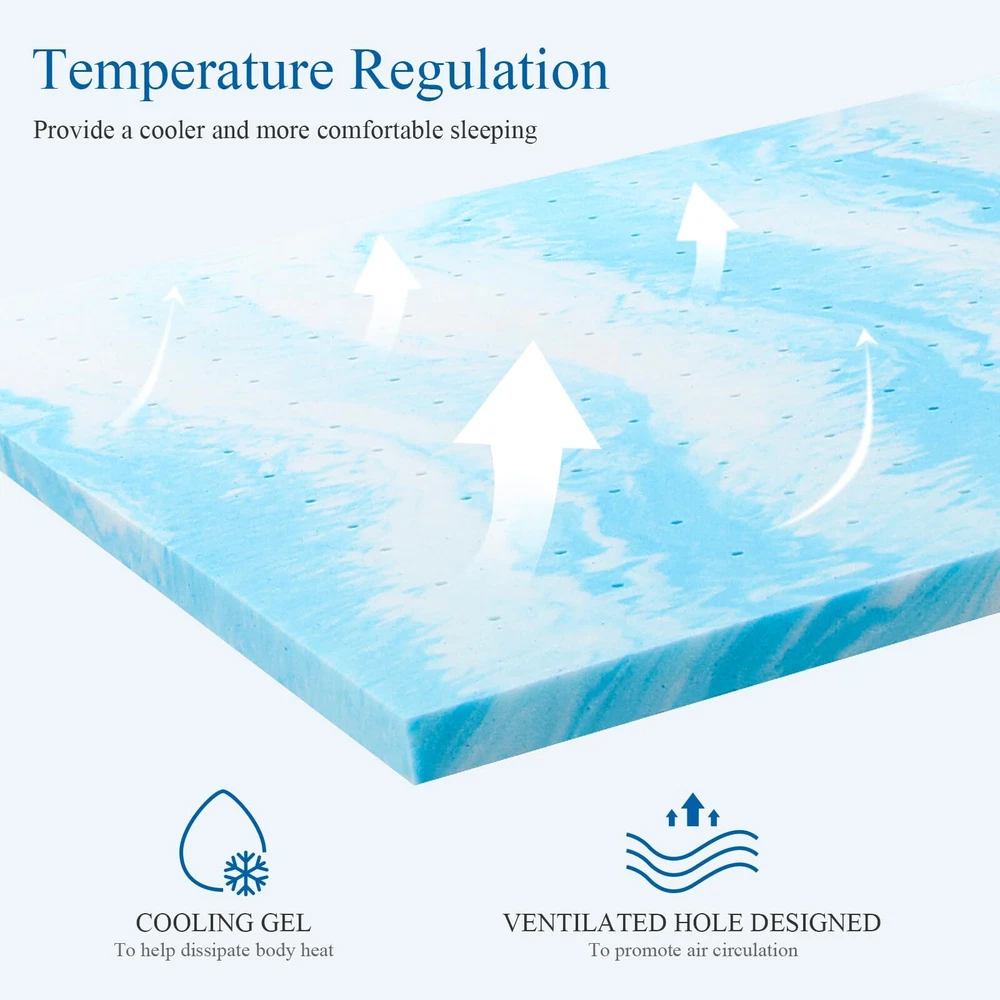 Gel memory foam mattress toppers offer a combination of comfort, support, and temperature regulation, making them a popular choice for individuals looking to improve their sleep quality and overall well-being. 【Support Meets Pressure-relieving and Temperature-regulation for the Best Sleep Ever】The twin mattress topper is made of high-quality memory foam. Specially designed for individuals seeking additional comfort. 【Temperature Regulation】The gel infusion in memory foam helps dissipate body heat, preventing overheating during sleep. Mattress topper can provide a cooler and more comfortable sleeping environment, especially for those who tend to sleep hot. 【Pressure Relief】Mattress topper conforms to the body's contours, which helps distribute weight evenly and alleviates pressure points. This can be particularly beneficial for individuals with joint pain, back pain, or other musculoskeletal issues. 【Ventilation and Refreshing】The gel memory foam mattress topper has small holes designed for ventilation to promote air circulation and prevent sleeping overheating, to help you get a restful night's sleep. 【CertiPUR-US Certified - Health and Safe】The gel memory foam of the mattress topper is CertiPUR-US certified, to ensure your sleep soundly knowing that it is performance tested and meets standards for content, emissions, and durability.