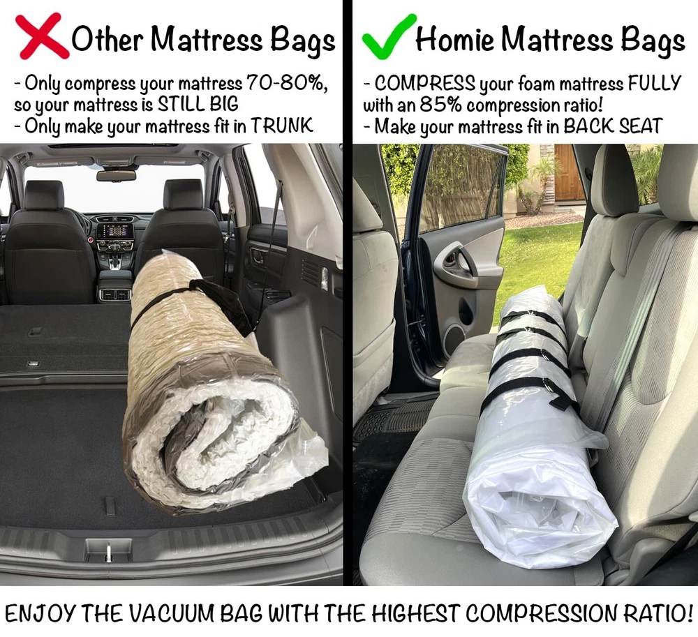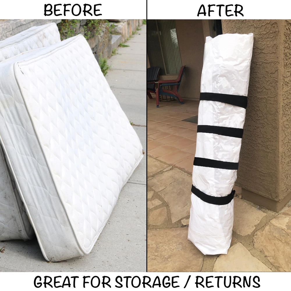 Save Money On Moving Costs - Rather than having to rent a big truck to fit your mattress or movers, save money and do it yourself by being able to fit your mattress in your car! Compress Your Mattress - With the vacuum seal technology, and household vacuum cleaner can be used to compress your mattress to a fraction of its size. Just like when it was first delivered to you. Protect Your Mattress - An added benefit of the airtight seal that is formed when closing this bag is that it protects your mattress from dust, allergens, moisture, and bugs, keeping you mattress clean and safe during storage. Durable Construction - The mattress bag was made with durability in mind. The leakproof valve, double zip seal, and 100 micron (4 mil) thick plastic are premium quality. Reusable Design - The mattress bag is made with all reusable components. With careful use, this bag can be used multiple times and save you money anytime you move the mattress. Simply open and close the zip lock as many times as you need. PATENT PENDING β π¦ππ₯ππ‘π π¬π’π¨π₯ π ππ§π§π₯ππ¦π¦ - Compress your foam or inner spring mattress with vacuum seal technology to the original size it came packed to you. This makes moving and returning it super easy! Works with mattresses from all the foam mattress and inner spring mattress companies that ship their mattress in a box. β π¦ππ©π π π’π‘ππ¬ πͺππππ π π’π©ππ‘π π’π₯ π₯ππ§π¨π₯π‘ππ‘π - Mattresses can be a pain to move or return, they are big and bulky. By compressing the mattress you can save on moving costs by not having to rent a truck to move it. Just move it in your car for free! β πππ₯π§ππππ§ π£π₯π’π§πππ§ππ’π‘ - The airtight seal protects your mattress against moisture, dust and dirt. With a double zip seal, this mattress bag ensures a good seal. β π₯ππ¨π¦ππππ πππ - With proper care, this bag can be reused for multiple moves as it is made with durable components. This will save you a bunch of money in the long run. β ππ¨π₯ππππ π£πππ¦π§ππ - This bag is made with durability in mind, it is 125 microns or 5 mil thick to ensure reliability.