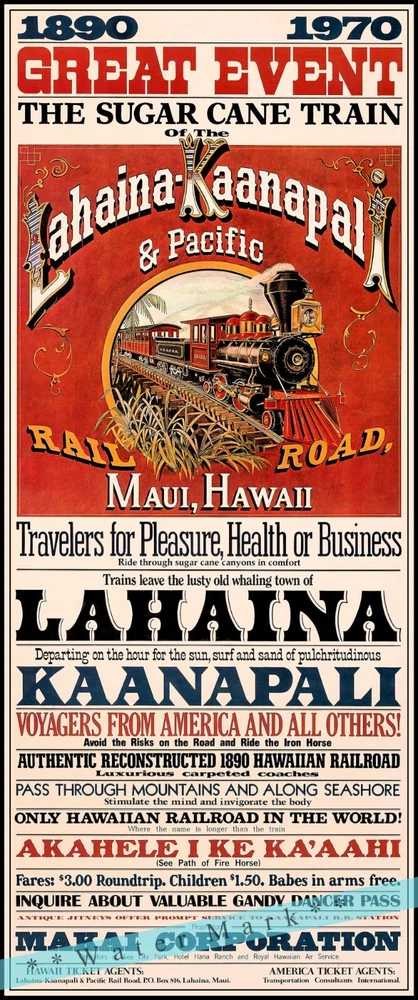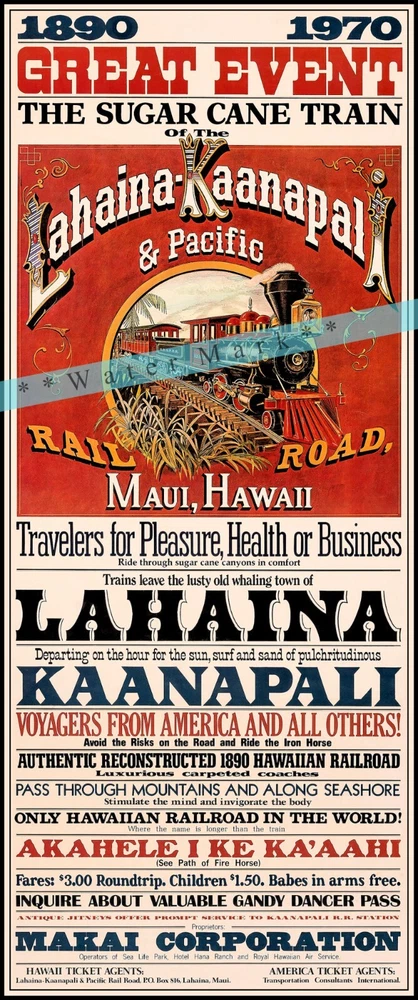 Maui Hawaii 1970 The Sugar Cane Train Event Lahaina Kaanapali & Pacific Railroad Authentic Reconstructed 1890 Hawaiian Railroad Lahaina served as a major whaling port and fishing town in the 1800s due to its prime location on whale migration routes, calm ocean conditions and endless days of perfect sunshine. With as many as 400 ships at a time docked in the harbor, Lahaina soon became a sailor's dreamland. Vintage Poster Print Retro Style Restored Art ***We offer Free US Postage or Reduced Postage for Canada & Worldwide. **No charges for additional prints worldwide. ***These are not framed or stretched or mounted NOTE:**Delivery dates shown are only "Suggested" Order Early To Avoid Post Delay Dramas **Read Please: The print looks best with a nice mat (passe - partout or passepartout ) and frame. These prints are the exact proportion as the original and will not be stretched to fit the paper or canvas...this would cause a distorted print The image will be the exact aspect ratio as per the original poster, so there might be more white on the top and bottom, or side to side. Options available..use the drop-down menu * Watermark will not be on your image. *Cloth Canvas an artist canvas used also in museums and art galleries *Photo Gloss Paper is a high-quality Professional Photo paper *Matte Photo Paper is a great solution if you do not want a Gloss, this paper is great with colors *Luster Photo Paper this photo paper is neither glossy or mat. Glossy paper has a smooth texture, luster paper is slightly textured. This option is a good choice for something in between Metallic, Photo Gloss and Matte *Metallic Pearlescent Photo Paper is a very high-quality paper with a Pearlescent sheen, a glossy finish, and unique metallic appearance, these prints have extra visual interest and depth. This paper uses a combination of film laminate layers that produce striking, dimensional, lasting images on an ultra-bright background. The effect is sometimes described as "chrome on paper." This is NOT a metal plaque, it is a photo paper This poster print will be shipped in a sturdy container. We will ship usually within 24 business hours of payment, except for weekends or US Holidays If there is a question, please do contact me All is done to send you the best quality poster image. Don't forget to check out the Sales. There is a great Buy 3 Get 1 Free Offer!! Shipped with no extra postage..Worldwide! There are a variety of reasons why the images on your monitors don't match each other. The simplest is that each monitor is different; even monitors with the same model won't have colors that match up perfectly We are located, print and ship only from the USA The art is not AI generated, these are restored prints from originals