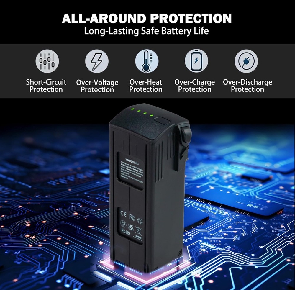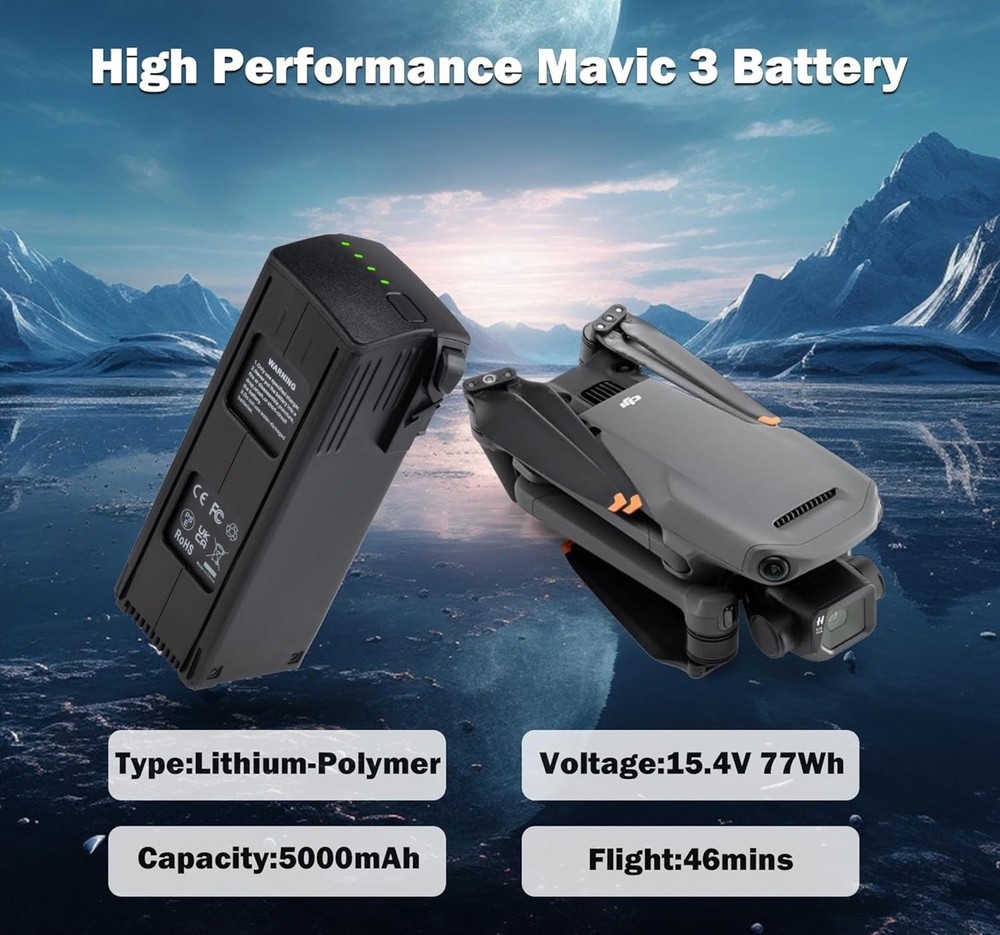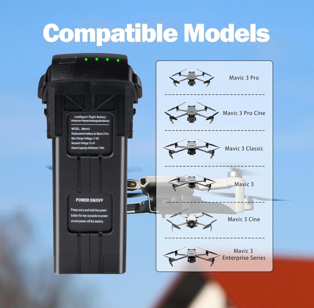#2532 Mavic 3 Battery, 5000mAh Intelligent Flight Battery Compatible with DJI Mavic 3 Pro, Mavic 3 Pro Cine, Mavic 3 Classic, Mavic 3, Mavic 3 Cine, Mavic 3 Enterprise Series Number of Batteries 1 Lithium Ion batteries required. (included) Brand JHTC Battery Cell Composition Lithium Ion Battery Capacity 5000 Milliamp Hours Recommended Uses For Product Drone Unit Count 1.0 Count 【Wide Compatibility】: This battery is compatible with various for Mavic 3 drones, including for Mavic 3/Mavic 3 Classic/Mavic 3 Pro/Mavic 3 Cine/Mavic 3 Pro Cine/ Mavic 3 Enterprise Series,providing accurate fit and reliable performance 【Battery Specs】: Lithium-ion battery, Voltage: 15.4V / Capacity: 5000mAh / Power: 77Wh. Fly with confidence, no need to worry about your flight plans 【Extended Flight Time】: Equipped with a 5000mAh capacity, the DJI Mavic 3 Intelligent Battery offers an impressive maximum flight time of up to 46 minutes, enabling you to capture more footage and explore farther distances. 【LED Indicator】: JHTC Mavic 3 battery built-in sensors to monitor the battery status with battery light in real-time. And you can check the battery information from the DJI GO App. The Mavic 3 Pro Cine battery weighs about 335 grams. Please check and strictly abide by local laws and regulations before flying 【Quality Assurance】: The Mavic 3 battery is made of high-quality materials to provide a stable and reliable power source, allowing your drone to perform at its best. Please fully charged and do the test flight before your first use