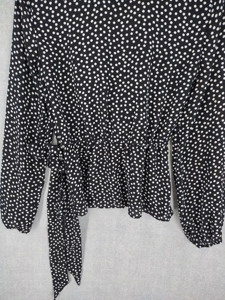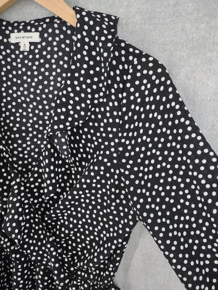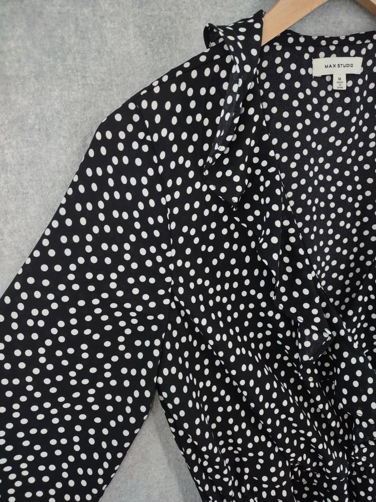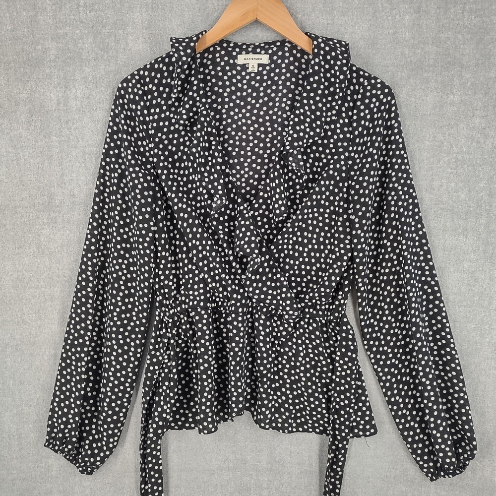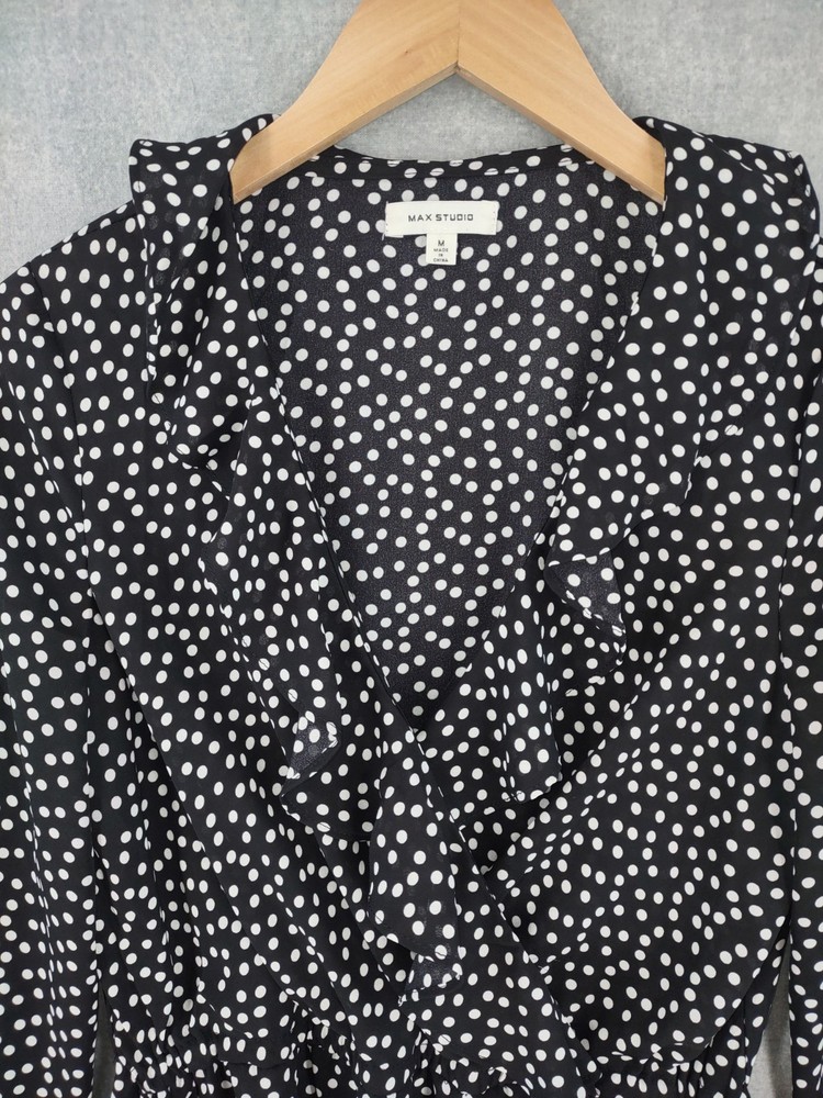 Welcome to Aspen Crossing, your destination for modern western bohemian style reflecting the rugged beauty of our American West. Max Studio Top Womens Medium Black Dop Wrap Ruffle Flirty V-neck Tie Long Sleeve 23" LENGTH: Measured from the top of the shoulder to the hem. 17.5" CHEST WIDTH: Underarm to underarm, measured flat from left to right. It is always best to compare the measurements above with a top that fits you comfortably. CONDITION - Excellent pre-owned condition. All items are cleaned per EBAY standards. Not spot treated. See the photo gallery to view this items measurements and condition. SHIPPED - USPS First Class Mail unless item weight requires priority mail. RETURNS accepted, must be returned within 30 days in original condition to receive a full refund. SHIPPING AND HANDLING We ship all packages within five business days Monday through Friday except Holidays. Consolidated shipping is available for multiple purchases. Thank you for helping our planet and buying previously owned and loved items. I am grateful for your business. Enjoy! Check out our eBay store and follow us. There are new listings daily. CUSTOM SKU: Disclaimer: While we make every effort to capture the most accurate depiction of every item when photographing, colors may vary from screen display to in person therefore we cannot guarantee exact shade on any item. Message us if you have questions.