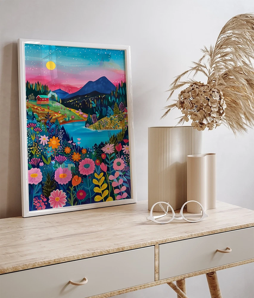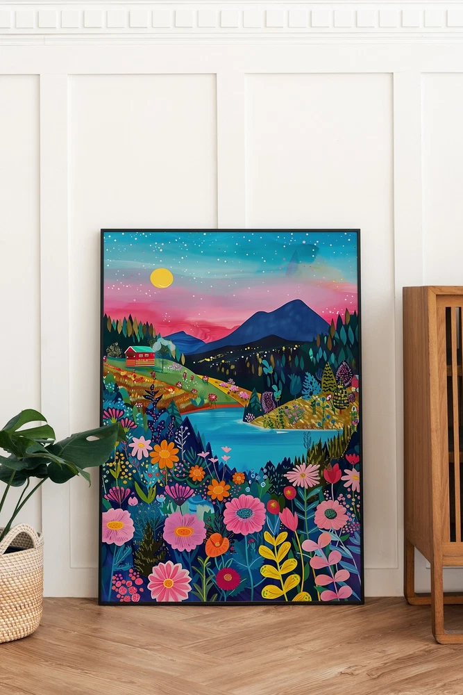 Maximalist Floral Garden Mountain Valley Artwork Colorful Wall Art Art Living Room Print Scenery Art Floral Hills Material: Premium luster photo paper Print type: Inkjet printing One side printed + The finish provides the highest possible resolution and color saturation + Lasts up to 200 years in color and 400 years in black-and-white + Printed on high-quality resin-coated photo base paper medium + Posters can be hung with double-sided tape, tacks, or framed + Hand washing with a gentle cry cloth is recommended for extended durability I will hand select the best choice of paper for your chosen design to ensure top quality results for a beautiful, bright and luxurious print. All prints are sealed in cellophane slips for protection during transportation, and are shipped in a protective cardboard envelope.