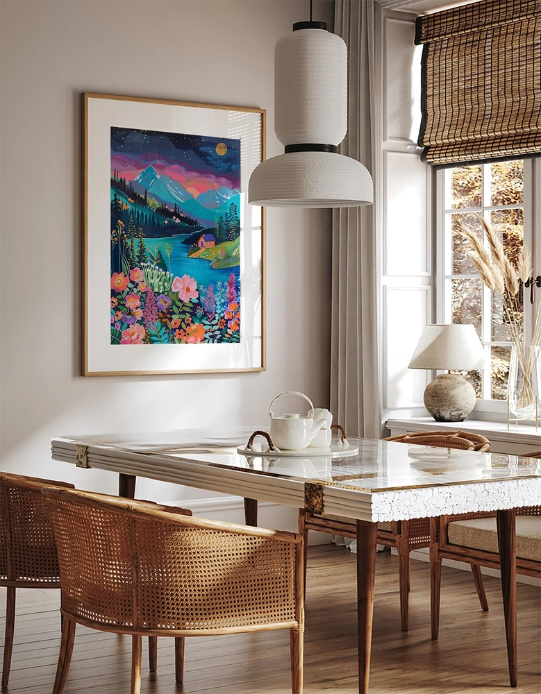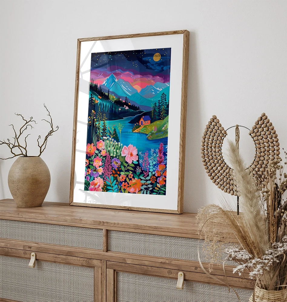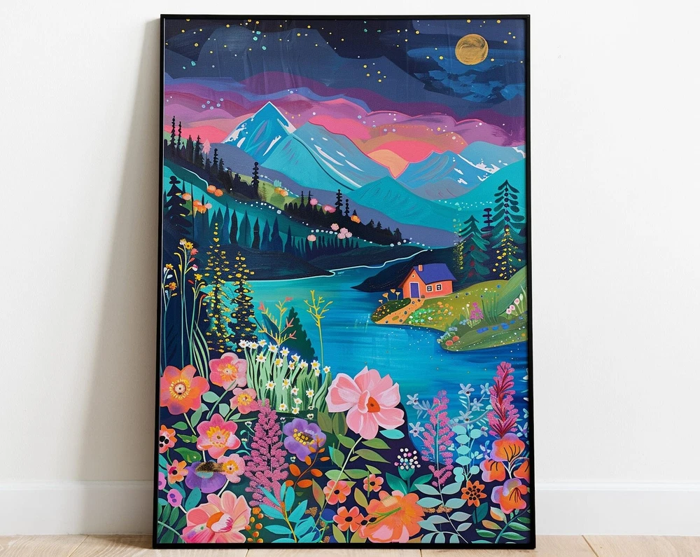 Maximalist Floral Garden Mountain Valley Artwork Colorful Wall Art Art Living Room Print Scenery Art Floral Hills Material: Premium luster photo paper Print type: Inkjet printing One side printed + The finish provides the highest possible resolution and color saturation + Lasts up to 200 years in color and 400 years in black-and-white + Printed on high-quality resin-coated photo base paper medium + Posters can be hung with double-sided tape, tacks, or framed + Hand washing with a gentle cry cloth is recommended for extended durability I will hand select the best choice of paper for your chosen design to ensure top quality results for a beautiful, bright and luxurious print. All prints are sealed in cellophane slips for protection during transportation, and are shipped in a protective cardboard envelope.