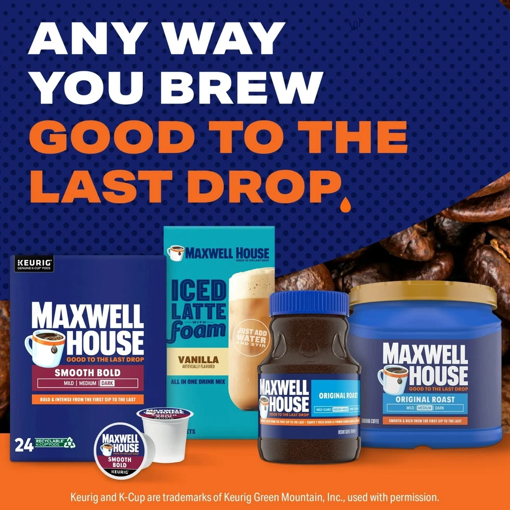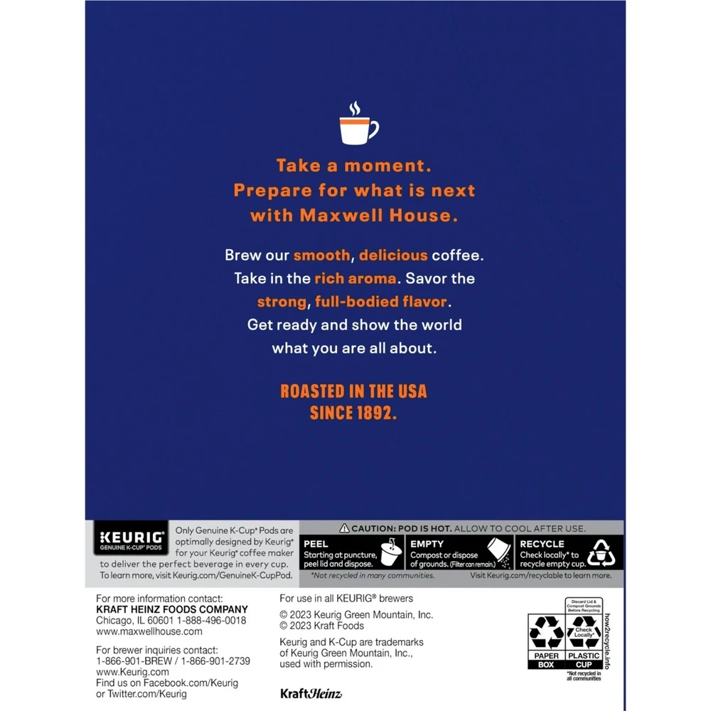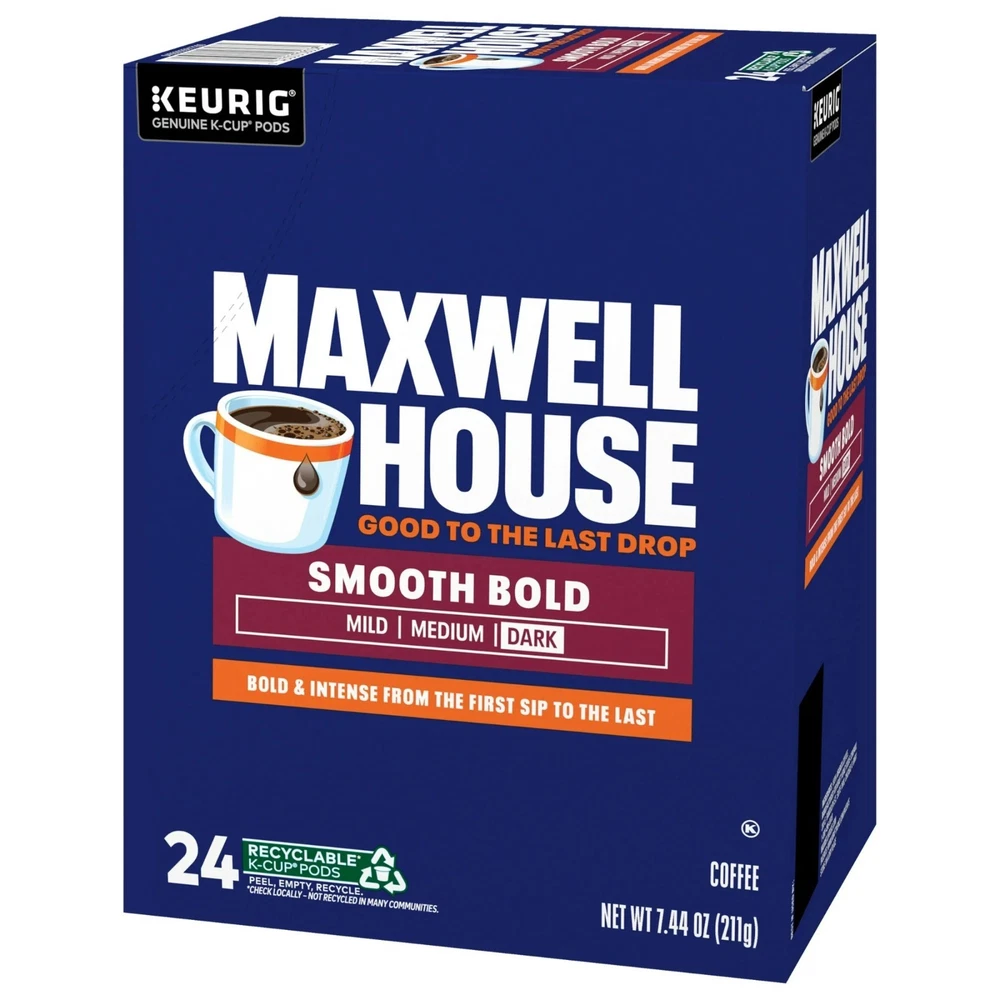 Maxwell House Smooth Bold Roast Coffee K-Cup Pods, 24 ct Brand New Item. Free Fast Shipping . Products Description: Maxwell House Smooth Bold Roast Coffee K-Cup Pods have a consistent signature taste that is good to the last drop. This intensely roasted K-Cup coffee is rich with an intense aroma and is the perfect caffeinated beverage to start your day. It's just one of the many delicious Maxwell House coffee flavors, now available as single cup coffee pods. Made with 100% pure coffee, this Maxwell House smooth bold coffee is great served black or with cream and sugar. Brew a single cup of this bold roast ground coffee in any Keurig brewing system. K-Cup pods make it easy to get a cup of coffee fast. This 7.44 ounce box of one-cup coffee pods is packaged in 24 individual K-Cups for easy single serve brewing. From lively light roasts to full-bodied dark blends, Maxwell House's signature taste is created through a process that isn't done the easy way, but the right way. For 125 years. Maxwell House offers a wide variety of K-Cup coffee pods and coffee drinks. Check out light roast K-Cups next. About this item: · 24 ct box of Maxwell House Smooth Bold Roast K-Cup® Coffee Pods · Brew our smooth, delicious coffee, take in the rich aroma and savor the strong, full-bodied flavor · Bold and intense from the first sip to the last · A consistently great taste that you can brew to take your day to your max · Take a break, unplug a little and gear up for what's next with a cup of Maxwell House coffee · Single-serve K-Cup® pods are compatible with all Keurig brewers · K-Cup® pods are recyclable* — simply peel the lid, empty the grounds from the cup and recycle the cup *Check locally – Not recycled in many communities · Roasted in the USA since 1892 · Maxwell House inspires the kind of coffee break that helps you pause, reset and take on whatever comes next Ingredients 100% ARABICA COFFEE. Return & Exchange: We Accept return as per eBay Return Policy, Customer satisfaction is our priority. If there is a problem with your order then please contacts us, we will provide you the best solution. Return shipping is the buyer's responsibility unless the return is a result of our mistake. We will pay for shipping replacement back to you if an exchange is requested. Note: Customer satisfaction is very important to us. If you have any problem with your order, please contact us and we will do our best to make you satisfied, please do not a negative feedback before we resolve your problem, we guarantee that your issue will be solved quickly. This item cannot be shipped to AK, HI, Puerto Rico, FAA Address, APO, FPO, PO Box and outside of USA.