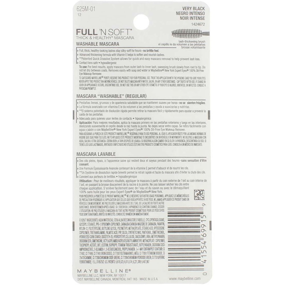 Product Description Maybelline's Full 'N Soft Mascara builds full, healthy-looking lashes without the brittle feel. The unique formula prevents loss of lashes with a Quick Dissolve System that allows easy mascara removal. The advanced thickening formula with Vitamin E helps to soften and nourish lashes without any clumps or globs. Let your eyes do all the talking with a lash look that speaks volumes. Follow these expert tips: For maximum impact, begin by combing your lashes, then create the look of extra long lashes using an eyelash curler Carefully align the eyelash curler with your lashes and hold for five to ten seconds Hold the wand in one hand, and with the other, gently lift the eyelid back so you have full leverage to coat the lashes from root to tip Pull the wand out of the tube and wipe any excess product against the opening of the container - you can always add more later on Apply mascara at the base of your lashes and sweep up through the ends, wiggling the wand from side to side. This will coat the sides of the lashes too Ingredients Water, Beeswax, Cyclopentasiloxane, Glyceryl Stearate, Ppg-17/Lpdi/Dmpa Copolymer, Carnuaba Wax, Pariffin, Nylon-12, Polyethylene, Butylene Glycol, Polymethyl Methacrylate, Stearic Acid, Vp/Eicosene Copolymer, Triethanolamine, Palmatic Acid, Pvp, Silica, Synthetic Wax, Panthenol, Dimethiconol, Hydrolyzed Corn Starch, Isoceteth-20, Hydroxyethylcellulose, Diazolidinyl Urea, Methylparaben, Disodium Edta, Simethicone, Octylacrylamide/Acrylates/Butylaminoethyl, Methacrylate Copolymer, Tocopheryl, Acetate, Bht, Lecithin, Isoprpyl Titanium Trisostearate, Butylparaben, Disodium Cocoampodiactate, 2-Oleamido, 3-Octadecanediol, Proplynparaben. (+/- May Contain: Ci 77492, Ci 77499, Ci 77491/Iron Oxides, Ci 77007/Ultramarines, Mica, Ci 77891/Titanium Dioxide, Ci 75470/Carmine, Ci 77288/Chromium Oxide Greens, Ci 77289/Chromium Hydroxide Green, Ci 77510/Ferric Ferrocyanide). Instructions Sweep the brush from root to tip of lashes Do not let mascara dry in between coats Easily remove mascara with Maybelline Expert Eyes 100% Oil-Free Eye Makeup Remover Product Description Maybelline's Full 'N Soft Mascara builds full, healthy-looking lashes without the brittle feel. The unique formula prevents loss of lashes with a Quick Dissolve System that allows easy mascara removal. The advanced thickening formula with Vitamin E helps to soften and nourish lashes without any clumps or globs. Let your eyes do all the talking with a lash look that speaks volumes. Follow these expert tips: For maximum impact, begin by combing your lashes, then create the look of extra long lashes using an eyelash curler Carefully align the eyelash curler with your lashes and hold for five to ten seconds Hold the wand in one hand, and with the other, gently lift the eyelid back so you have full leverage to coat the lashes from root to tip Pull the wand out of the tube and wipe any excess product against the opening of the container - you can always add more later on Apply mascara at the base of your lashes and sweep up through the ends, wiggling the wand from side to side. This will coat the sides of the lashes too Ingredients Water, Beeswax, Cyclopentasiloxane, Glyceryl Stearate, Ppg-17/Lpdi/Dmpa Copolymer, Carnuaba Wax, Pariffin, Nylon-12, Polyethylene, Butylene Glycol, Polymethyl Methacrylate, Stearic Acid, Vp/Eicosene Copolymer, Triethanolamine, Palmatic Acid, Pvp, Silica, Synthetic Wax, Panthenol, Dimethiconol, Hydrolyzed Corn Starch, Isoceteth-20, Hydroxyethylcellulose, Diazolidinyl Urea, Methylparaben, Disodium Edta, Simethicone, Octylacrylamide/Acrylates/Butylaminoethyl, Methacrylate Copolymer, Tocopheryl, Acetate, Bht, Lecithin, Isoprpyl Titanium Trisostearate, Butylparaben, Disodium Cocoampodiactate, 2-Oleamido, 3-Octadecanediol, Proplynparaben. (+/- May Contain: Ci 77492, Ci 77499, Ci 77491/Iron Oxides, Ci 77007/Ultramarines, Mica, Ci 77891/Titanium Dioxide, Ci 75470/Carmine, Ci 77288/Chromium Oxide Greens, Ci 77289/Chromium Hydroxide Green, Ci 77510/Ferric Ferrocyanide). Instructions Sweep the brush from root to tip of lashes Do not let mascara dry in between coats Easily remove mascara with Maybelline Expert Eyes 100% Oil-Free Eye Makeup Remover Warnings Safety Warning: To safeguard purity, reserve this product for your personal use. Treat the applicator with the hygienic care you give your eyes. Never apply this product in a moving vehicle. Do not dilute with water, saliva, or any other substance. Cap tightly after use. If a change in odor or appearance occurs, discontinue use. Do not use this or any other cosmetic if your eye is injured, irritated, or infected. Consult a physician promptly. Always replace your mascara every 3 months. This is the most hygienic replenishment time for all eye makeup products. Plus, it ensures your mascara never gets too dry and clumpy Always let mascara set (but not dry!) between applications. Two coats of mascara should always be applied, but never more than that. Wait 10 seconds for formula to set before applying second coat so lashes won't clump Never apply before liner. Your fresh coats of mascara will smudge and clump together if you apply liner after mascara. Applying mascara before liner also prevents you from being able to get as close to the lash line as possible. Remember - liner first, then two coats of mascara! Disclaimer The product descriptions and instructions provided by vitabox.com are for informational purposes only and are qualified in their entirety by the information available from manufacturers of the products. You should carefully read all product packaging, and contact the manufacturer with any questions before using a product. While we endeavor to ensure that product descriptions are current, manufacturers sometimes change their products. We are not liable for inaccuracies or misstatements about products. We do not provide medical advice or recommendations. You should not use the information provided by vitabox.com for diagnos