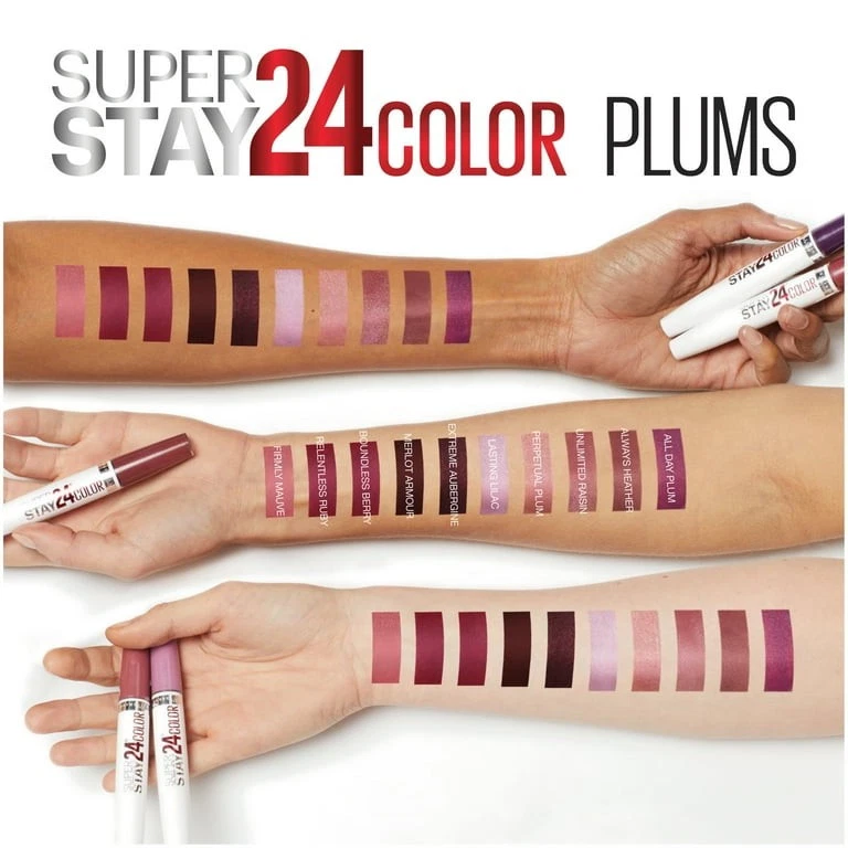 Maybelline SuperStay 24H 2-Step Liquid Lipstick Raisin: Meet the wonder that stretches the limits of long-lasting lip color. Our liquid formula lasts for 24 hours and features an ultra-conditioning balm to keep lips moisturized through the day. The exclusive Microflex technology in SuperStay 24H Liquid Lipstick ensures color won't cake, flake, or dry. Now, available in four smile-brightening shades. Each new shade is enhanced with blue color pigments to minimize yellow undertones in the teeth. Flexible formula moves with your lips for no caking or flaking . •Ultra-conditioning, refillable balm seals in softness for all-day comfort •Bring on high-impact lip color that lasts all day •Microflex technology keeps your color fresh for up to 24 hours •Color of a lipstick, glides like a gloss, and moisturizes like a lip balm •Available in a brilliant range of amped-up shades