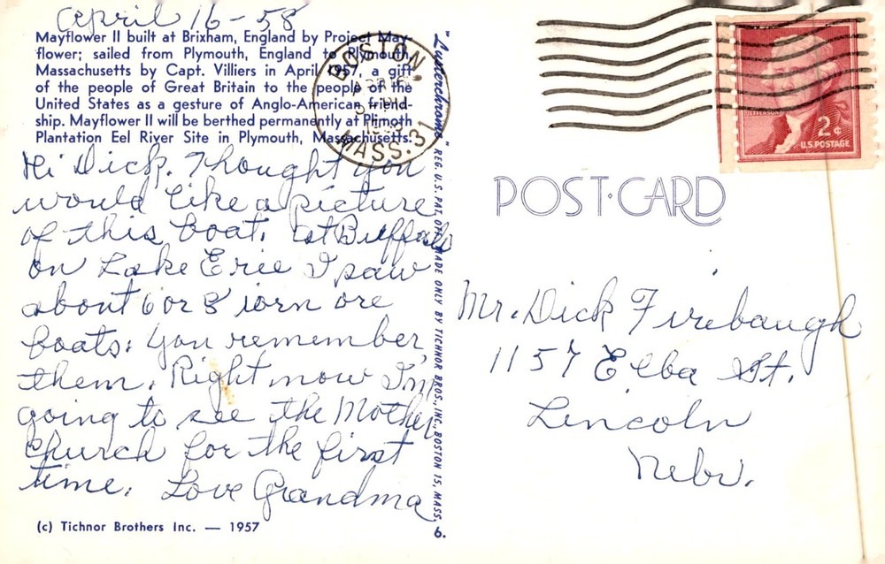 MAKE AN OFFER. THE MORE YOU BUY THE BETTER DEAL I WILL ACCEPT Mayflower II, a replica ship built in Brixham, England, sailed to Plymouth, Massachusetts in April 1957 as a gift symbolizing Anglo-American friendship. The postcard features a picture of the boat.
