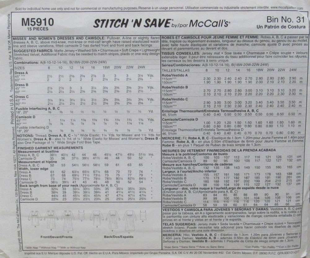 McCalls 5910 Womens 8-16 EASY Pullover Empire V-Neck Dress Midi Maxi Pattern UNC McCalls 5910 Womens 8-16 EASY Pullover Empire V-Neck Dress Midi Maxi Pattern UNC McCall's Easy Stitch-n-Save Sewing Pattern 5910, dated 2009 Women's Pullover Empire Dresses Sizes 8--10--12--14--16 are ALL included UNCUT, factory folded, complete & unused Good envelope too! ~I mail All patterns in an archival quality storage sleeve. ~I ship SAME or NEXT business day . . . always! ~I don't use tracking for patterns. They are shipping USPS Flat 1st Envelope. ~I personally guarantee delivery within 10 business days or will process a full refund! Please be sure to check my other store listings! Listing and template services provided by inkFrog