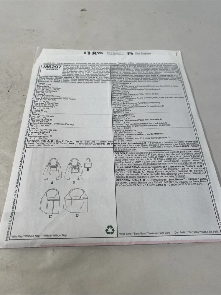HomeMcCall's M6297 Totes Sewing Pattern Bags Purse Handbag Uncut