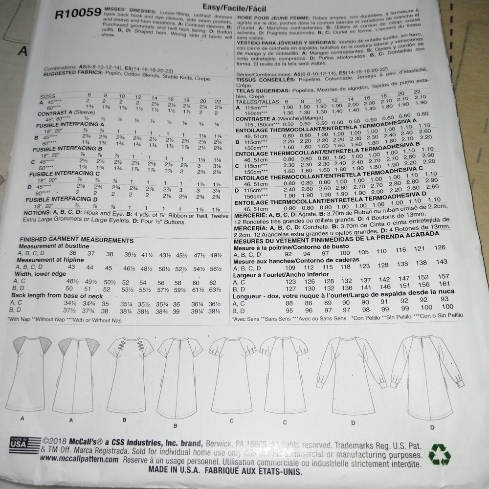 The product is a McCall's sewing pattern R10059/M7862 that offers 4 styles of Misses dresses in sizes 14-22. The pattern is uncut, ensuring that the dress designs can be tailored to fit specific sizes accurately. Made in the United States, this pattern caters to female dress sizes ranging from 14 to 22, providing a variety of options for creating custom-made dresses without the need for modifications. Perfect for crafting and sewing projects, this McCall's pattern is a valuable resource for those looking to create unique and fashionable dresses.