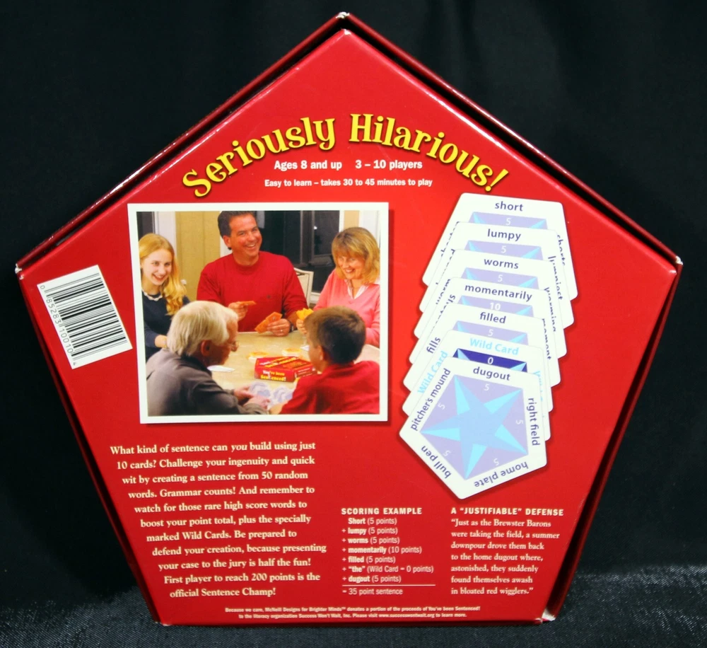 This complete game, from McNeill Designs titled "You've Been Sentenced," is a fun and challenging strategy game for families, with a recommended age range of 8+. The goal of the game is to create sentences and then have all the other players judge them. The defending player must justify their sentence. There will, quite possibly, be sentences that have never been uttered before, in history, and trying to justify them is what the game is all about. The game includes a deck of cards, a score pad, and instructions to make it easy to start playing right away. The game, manufactured in China, has won the 2007 Creative Child Magazine Seal of Excellence award. This game is a great addition to any family game night and is sure to provide hours of entertainment. Each item we ship is carefully packaged to prevent any damage and is shipped immediately with tracking.