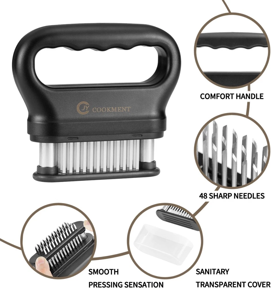 【TO BE A PROFESSIONAL CHEF】- JY COOKMENT meat tenderizer tool can creates tiny channels within the meat and break down the connective tissues which make meat tough and chewy. 【EASY TO USE AND CONTROL】- Our meat tenderizer is ergonomic design with a comfortable, non-slip handle. Simply press down on the top and the sharp blades cut through the toughest fibers of your particular cut of meat. 【REDUCE MARINADE & COOKING TIME】- These tiny channels within the meat allow marinades to be fully absorbed into the meat in just about 5 minutes. They also allow heat to penetrate more quickly to reduce cooking time by up to 40%. Less cooking time means less loss of natural flavors and juices. 【ERGONOMIC DESIGN AND EASY TO CLEAN】- After using this meat tenderizer, just soak in warm soapy water after a few minutes and wash it with our cleaning brush. Dishwasher Safe 【ELEGANT PACKAGE IS GOOD CHOICE FOR GIFT】- JY COOKMENT meat tenderizer with elegant package, it is really nice to be a gift to your family or friends. 7*24 hours friendly customer service and If you're not happy, simply return meat tenderizer. No questions asked! JY COOKMENT2024 ECONOMIC MEAT TENDERIZER Economic Meat tenderizer JY COOKMENT JY COOKMENT kitchen Utensils will do you a favor to be a professional chef in your kitchen. Specialized in high-quality Kitchen Utensils & Gadgets.Your satisfied is our Goal! 2024 JY COOKMENT ECONOMIC MEAT TENDERIZER Tenderizer All of Enjoyment into Your Every Juicy Bite! JY COOKMENT meat tenderizer tool consists of 48 ultra-sharp blade that can easily break down the connective tissues of raw meat. And it allow marinade or seasoning penetrate in rapidly and intensely. which can solve all your troubles. If you use our Meat Tenderizer, the beef or sirloin cooked by yourself just like you have eaten in the best High-end restaurant. ECONOMIC SS304 material blades Dishwahsher Safe Ergonomic Handle Best / perfect gift for your friends and family WHY CHOOSET JY COOKMENT MEAT TENDERIZER? 48PCS ss304 sharp blades REDUCE 40% COOKING TIME While meat instantly seals on the outside, locking in juices, the connective tissue break down remains open, like little channels, allowing more hot air to flow through, without releasing juices – for meat that’s as quick as it is juicy and delicious. Comfort handle JY COOKMENT meat tenderizer ergonomic design with a comfortable, non-slip handle. Simply press down on the top and the sharp blades cut through the toughest fibers of your particular cut of meat. Juicy, Tender & Yummy for Every Bite! JY COOKMENT NEW DESIGN ECONOMIC meat tenderizer can creates tiny channels within the meat and break down the connective tissues easily Perfect Gift Choice!