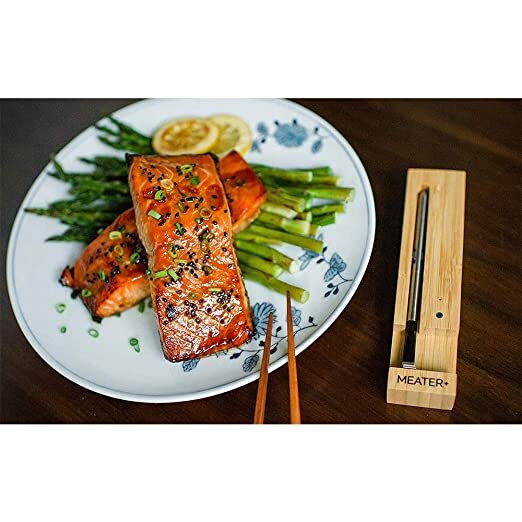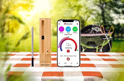 MEATER+165ft Long Range Smart Wireless Meat Thermometer for The Oven Grill Kitchen BBQ Smoker Rotisserie with Bluetooth and WiFi Digital Connectivity Authorized Dealer - Free and Fast Shipping The world's best selling meat thermometer with a built-in Bluetooth repeater! Get freedom from your grill, smoker, or kitchen. The NEW Long Range MEATER+ is the first truly wireless, smart meat thermometer that allows you to monitor your food up to 165 ft away. There’s nothing worse than an overdone piece of meat, which is why a reliable meat thermometer is an essential tool for any kitchen or BBQ setup. MEATER+ boasts unique, patented technology that measures both internal meat and ambient temperatures in the oven or grill for a superior result, every time. Also, MEATER+'s companion app sends estimated cook times and alerts to your smartphone over Bluetooth or WiFi, giving you the freedom to step away from the grill and enjoy the party or sit back and relax. MEATER Link: Extend your wireless range over WiFi. All you need is a 2nd smart phone/tablet to bridge the connection to your home WiFi network. Probe Spec: Stainless steel, water resistant, and easy to clean Bluetooth 4.0 wireless connection up to 165 ft Max internal temp: 212°F Max ambient temp: 527°F Rechargeable: Over 24 hours of continuous cooking per charge Charger Spec Built-in Bluetooth Repeater to extend range Store and charge your MEATER probe Magnetic backing: Attach your charger to any magnetic surface Portable and charges MEATER up to 100 times with 1 AAA battery Real wood to match any kitchen or outdoor decor LED indicator: shows charger battery state and probe connection status App Spec Connect up to 4 probes at once iPhone and iPad apps for iOS 10.0 and later Android app for versions 5.0 and later Alexa Skill Enabled: Just ask Alexa, ask MEATER how long until my food is ready. 165ft Long Range Model: 100% WIRE-FREE that’s perfect for outdoor cooking. The first truly wireless smart meat thermometer. Monitor your cook using the FREE app available for iOS (10.3 and later) / Android (5.0 and later) smart phones and tablets 2 Sensors, 1 Probe: Dual temperature sensors can monitor internal meat temperature up to 212°F and ambient / external temperature up to 527°F simultaneously. Dishwasher safe. Guided Cook System: Walks you through every step of the cooking process to guarantee perfect and consistent results. You can also set up custom alerts / notifications based on temperature and/or time Advanced Estimator Algorithm: Can estimate how long to cook and rest your food to help plan your meal and manage your time. Connectivity Suite: Monitor your cook from a phone or tablet over Bluetooth. Extend your range Using MEATER Link WiFi and MEATER Cloud to use Alexa and monitor your cook from a computer. Built-in Bluetooth repeater in the charger extends the wireless range up to 165ft. 100% Wire-Free: No wires. No fuss. The first truly wireless smart meat thermometer. 2 Sensors, 1 Probe: Dual temperature sensors can monitor internal meat temperature (max: 212°F) and ambient temperature (max: 527°F). Guided Cook System: Walks you through every step of the cooking process to guarantee perfect and consistent results. Advanced Estimator Algorithm: Estimates how long to cook and rest your food to help plan your meal and manage your time. Connectivity Suite: Monitor your cook from a phone or tablet over Bluetooth. Extend your wireless range using MEATER Link WiFi and the MEATER Cloud. SPECIFICATIONS Probe Specs Bluetooth LE 4.0 wireless connection Maximum internal temperature: 212°F (meat) Maximum ambient temperature: 527°F (cooker) Stainless steel and ceramic construction Water resistant and easy to clean Dishwasher safe Rechargeable: Over 24 hours of continuous cooking Dimensions: 130mm length and 6mm diameter Charger Specs Built-in Bluetooth repeater extends range up to 165ft Store and charge your MEATER probe Magnetic backing: Attach anywhere Charges MEATER up to 100 times with one AAA battery Real wood to match any kitchen or outdoor decor LED indicator to show battery state Dimensions: 157mm L x 37mm W x 28mm H App Requirement iPhone and iPad apps for iOS 12.2 and later Android app for versions 8.0 and later Dual Sensors Measures both the internal meat temperature (within +/- 1°F) and the temperature close to the food. Durable Materials Made with stainless steel and heat resistant ceramic. Bluetooth Repeater Extends the wireless range up to 165ft Charger Sleek bamboo charging dock. Magnetic Backing Attaches to any metallic surface. Battery Power Charges the probe up to 100 times with a single AAA battery.