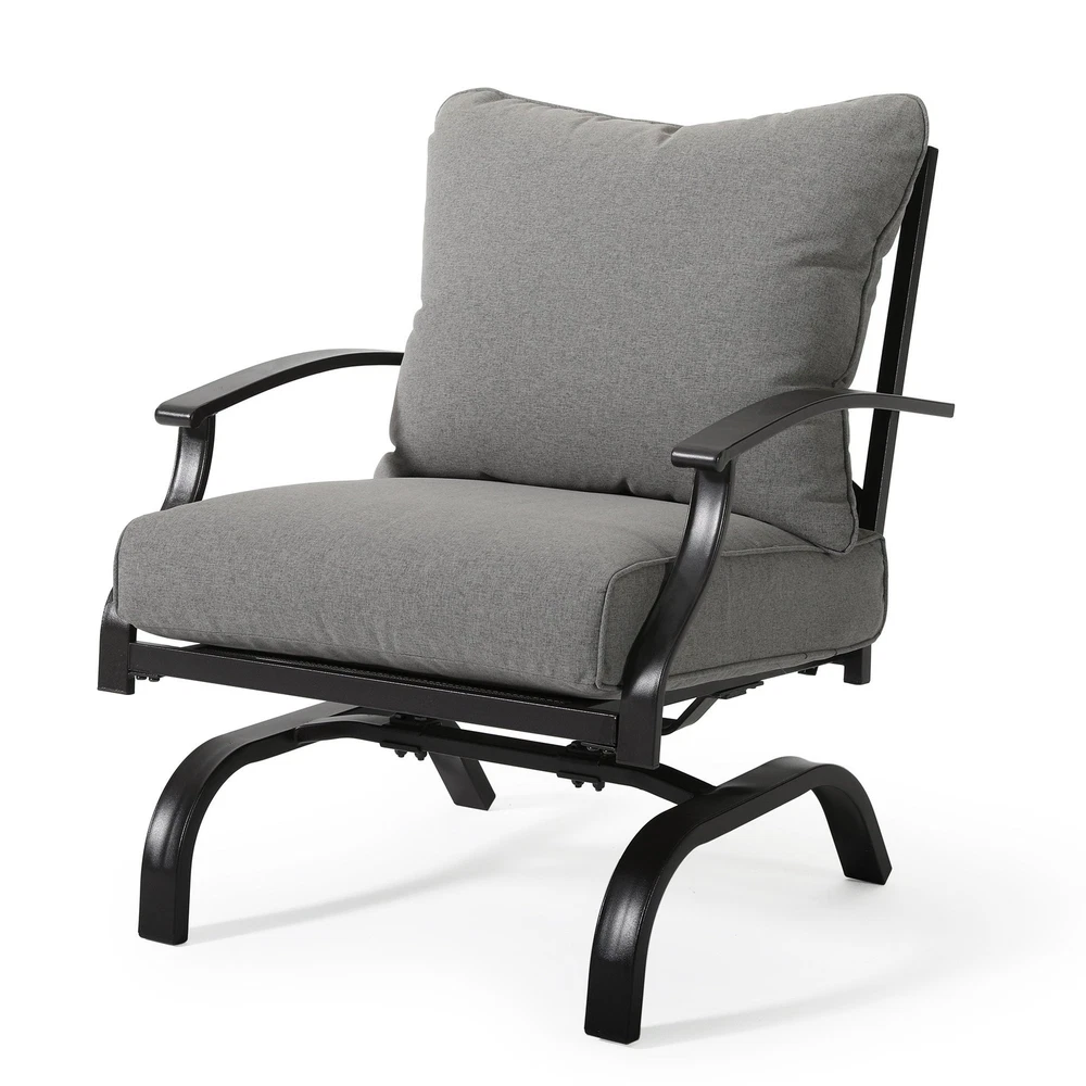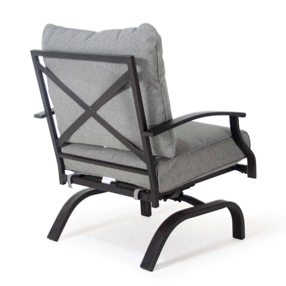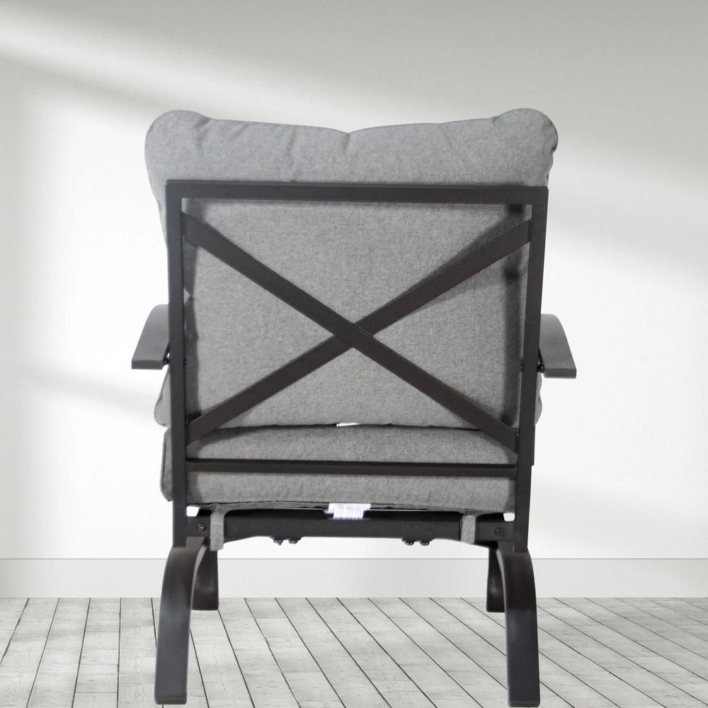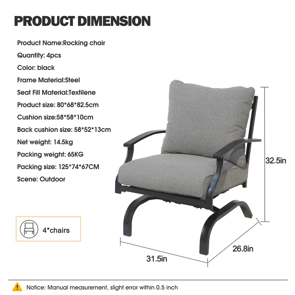 Specifications Place of Origin China Main Color Grey Main Material Steel Use Case Garden & Outdoor Outdoor Seating Type Multiple Chairs Seating Group Set Design Rocker & Glider Cushions Included Yes Frame Durability Weather Resistant Frame Cushion Durability Fade Resistant Cushion Dangerous Goods #dangerFlag# Dimensions & Weights Assembled Length (in.) 31.50 Assembled Width (in.) 26.50 Assembled Height (in.) 32.54 Weight (lbs) 32.00 Product Features The set includes 4 rocking-motion chairs with seat and back cushions Durable powder-coated steel frames Water- and UV-resistant Olefin upholstery Tufted back cushion for a better décor Foam-filled cushions of UV-resistant Olefin fabric cover Weight Capacity of each Chair: 250 lb. Seat Cushion Thickness up to 4' Description