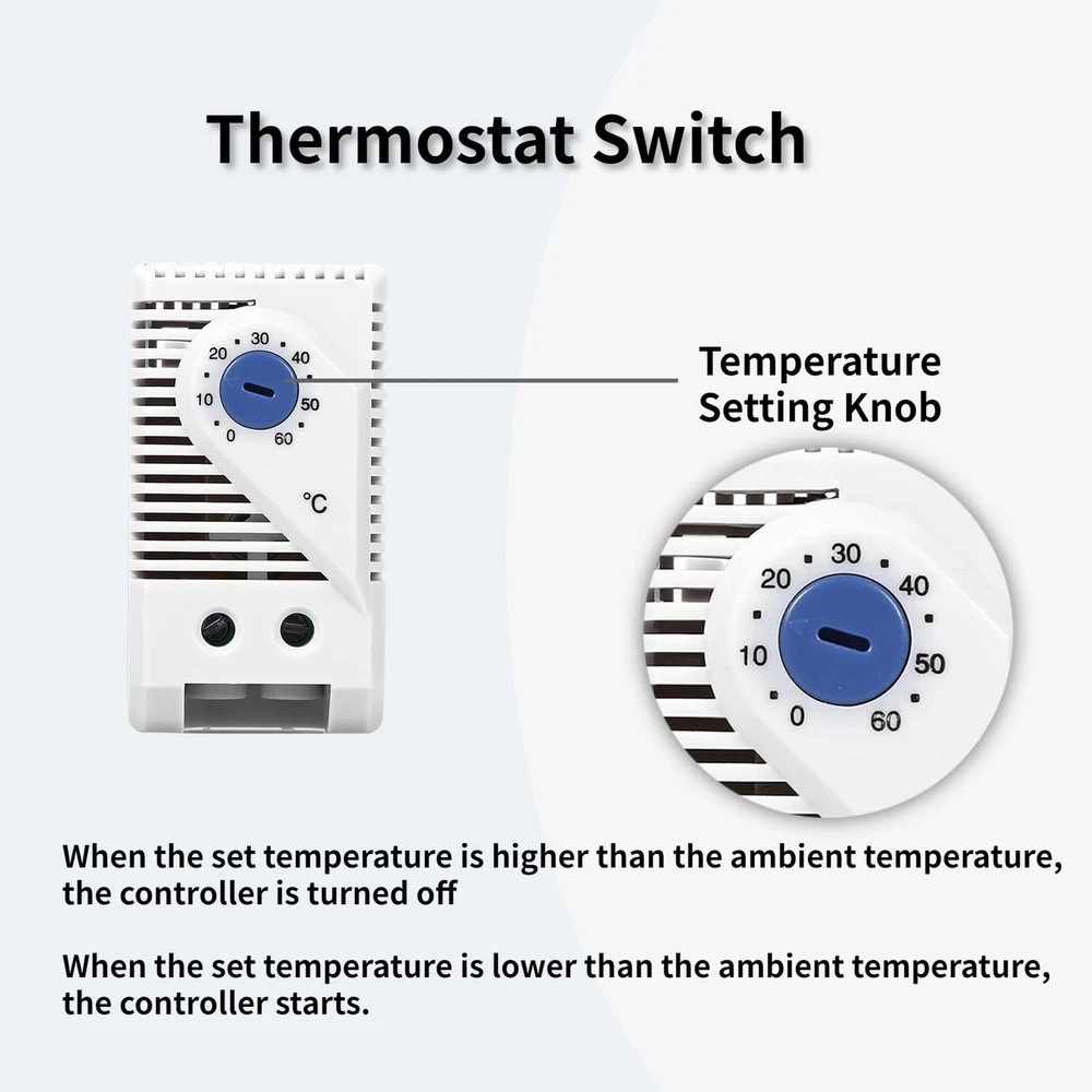 Specifications: Condition: 100% Brand New Material: Plastic + Electronic component Color: Shown as picture Type: Blue Button, Red Button (Optional) Adjustable Temperature: 0℃-60℃ Voltage: 110V-250V Sensor Element: Temperature sensing material Type: Quick action Resistance: <10mΩ Service Life: >100,000 cycles Switch Maximum Capacity: 250VAC, 10(2)A / 110VAC, 15(2)A DC 30W Wiring Mode: 2 pole terminal 2.5mm 2 wire Installation Method: 35mm DIN orbit Operating/Storage temperature: -20 to +80℃(-49 to +176℉) Protection Level: IP20 Size(L x W x H): Approx. 60 x 43 x 33mm / 1.8 x 1.7 x 1.3inch Weight: Approx. 52g Package Included: 1 x Mechanical Thermostat 【0-60°C】Our mechanical thermostats have a temperature control range of 0°C to 60°C, ideal for controlling heaters, filter fans, cooling devices and other signaling devices in your home, market, etc. 【ADJUSTABLE】The adjustable temperature thermostat has a large data scale and adjustable buttons for easy and convenient adjustment. Switch maximum capacity: 250VAC, 10(2)A / 110VAC, 15(2)A DC 30W. 【EASY INSTALLATION AND DISASSEMBLY】The thermal control regulator is designed with standard rail clips and has a 4-foot seat, which is easy to install and disassemble. The 2-wire circuit interface on the bottom of the thermostat makes wiring more secure and safe. 【WIDE APPLICATION】Our thermostat switch is made of high-quality plastic material, with fine workmanship, environmental protection, safety and durability. Primarily used to control cooling applications such as filter fans and other signaling devices. 【SATISFACTION 】We promise that every customer is 100% satisfied with the purchase. If you have any questions about the purchase, please feel free to us. We will give you a professional and detailed reply within 24 hours. Click to buy now!