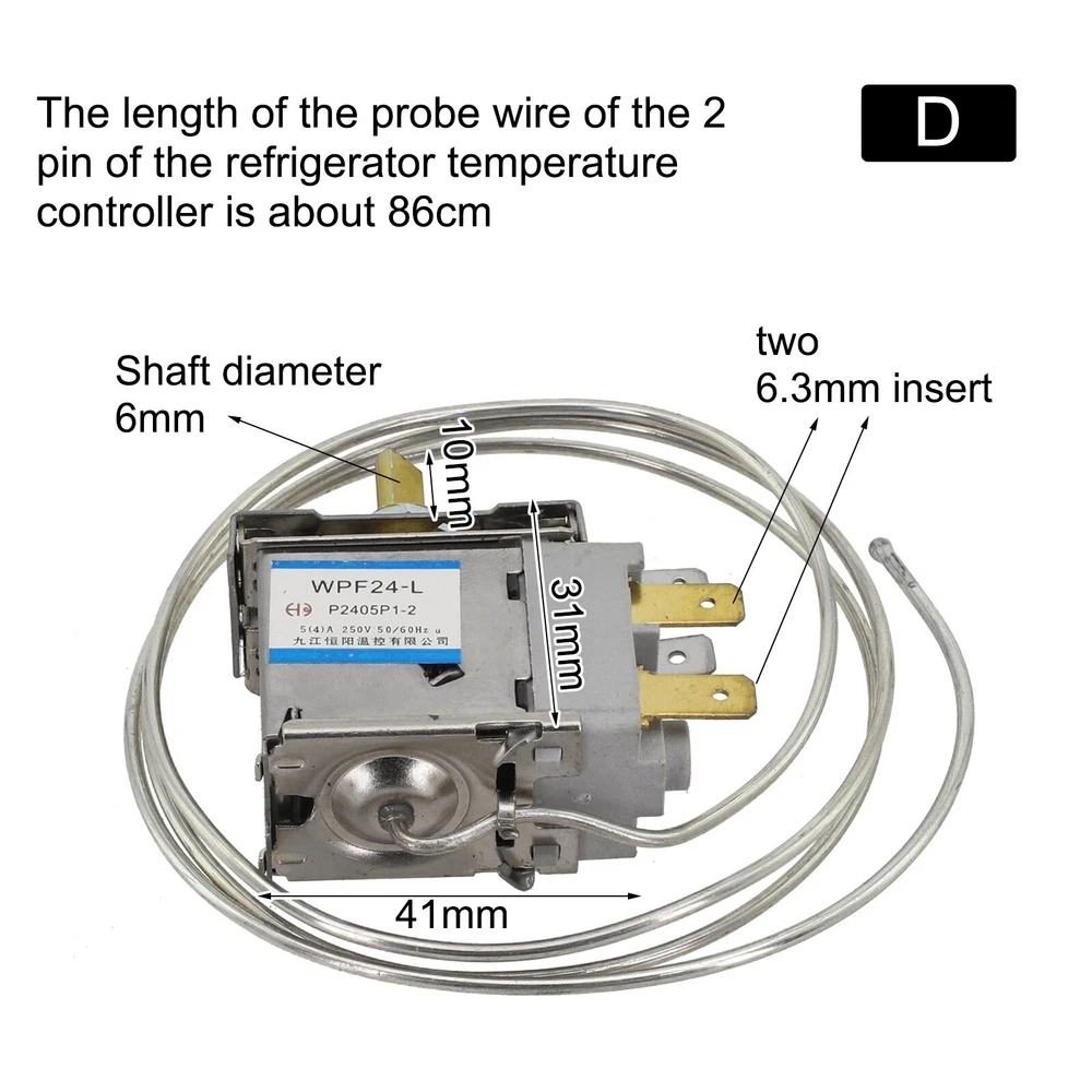 Mechanical Thermostat for Efficient Cooling in Refrigerators and Freezers DESCRIPTION Features: *Easy to install: Upgrade your refrigerator with this metal thermostat, easy to install and for ensure long service life. *Wide compatibility: Compatible with different models, this refrigerator thermostat is an Perfect repla cement for damaged thermostats, with a D-shaped shaft. * long-lasting: Made of metal, this refrigerator thermostat ensures durability, saving you time and money. It provides reliable high performance and efficient cooling for your refrigerator. *WDF18-L、WDF20-L、WPF22-L、WPF24-L Refrigerator Thermostat. *Versatile usage: Control the temperature of refrigerators, display cabinets, freezers, beverage cabinets, and similar products. Specifications: Part Name:Refrigerator thermostat temperature control switch Material:Metal Size:As shown Color:As shown Options: A: WDF18-L 3-pin fixed on both sides (for refrigerator) B: WDF20-L 3-pin fixed in the middle (for refrigerator) C: WPF22-L 2-pin fixed on both sides (for ) D: WPF24-L 2-pin fixed in the middle (for ) *Working voltage: AC 250V *Current: 4A/5A, 50Hz/60Hz *Heat: -1℃ to -9℃ *Preheat: -20℃ to 25℃ *Terminals: 2, 3 Package Content: 1 x Temperature Controller Note: 1. The real color of the item may be slightly different from the pictures shown on website caused by many factors such as brightness of your monitor and light brightness. 2. Please allow slight manual measurement deviation for the data. POLICES Shipping Payment WARRANTY We only ship to confirmed ebay Order addresses. Please comfirm that your Order address is in line with your shipping address. Please kindly note that the c ombined shipping is not provided because the shipping fee is calculated by weight. Also, the each additional item means exactly the the same color and size. It takes about 7 -15 working days to US; about 10-30 working days to other countries. Transit time may be a little delayed because of the bad weather and customs inspection . If you do not receive your item within 30 working days since payment finished, please contact us immediately for further assistance. Payment must be completed within 5 days. If you have any problems about payment, please contact us via ebay message. We strive for 100% customer satisfaction! Positive Feedback is very important to us. If you have any questions, p lease feel free to contact us via "Ask seller a question" . We will reply your email within 24 working hours.