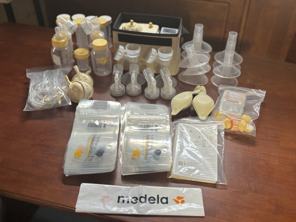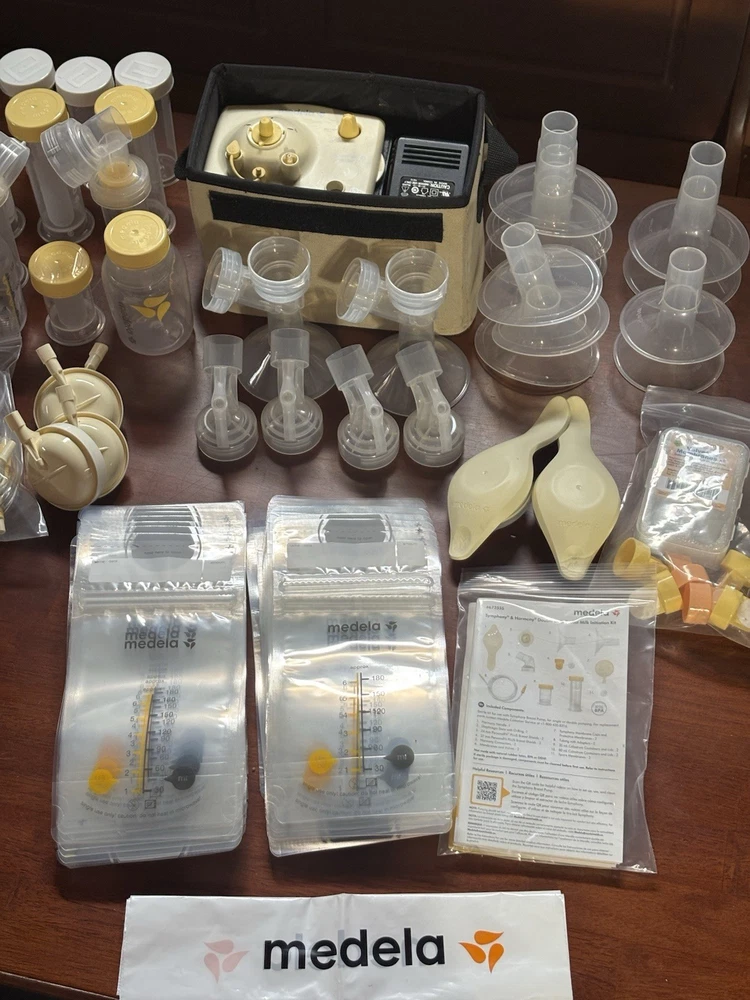 Feature : The Pump In Style Advanced Breastpump Starter Set is part of Medela's patented 2-Phase Expression technology pump family. Feature : Adjustable speed/vacuum control, Helps you choose your most comfortable setting. Medela's patented 2-Phase Expression® technology is Proven to get 18%* more milk when double pumping. One-touch let-down button: Lets you toggle between Stimulation and Expression phases for more efficient pumping sessions. INCLUDES: Power supply adapter AC 110v; Pump in Style tubing (3 NEW tube sets); PersonalFit breastshields (4) four medium (24 mm) & (4) four large (27mm); (8) connectors; 6 valves with 6 membranes, as well as an additional pack of membranes. 2-5 oz/150 mL breastmilk bottles w/lid & nipple: (11) storage containers w/ lids and two manual hand pumps. [Retail Price: $199.99 for just the pump machine] ***BONUS: Includes Over 100 Medela milk storage bags for freezing your liquid Gold!!***