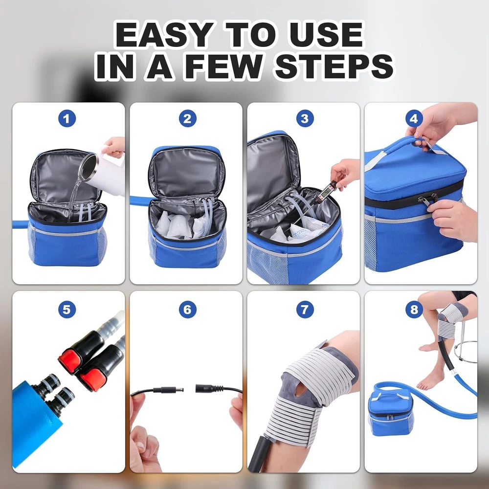 【Cold Therapy Machine】This Cold Therapy Machine provides a continuous circulation of cold water to effectively relieve pain and swelling caused by surgery, trauma, exercise, arthritis, sprains, tendonitis, and other joint and muscle problems. With cold therapy can slow down the blood flow to the injured area, allow the wound to heal faster. 【9 Quart Capacity - Long Lasting Ice Therapy】The Cryotherapy Freeze Kit System includes a 9-quart cooling water tank which holds 6 frozen water bottles. Typically, the larger the cooling bucket, the more ice it holds, which reduces the frequency of adding ice. This means a longer period of pain relief cold therapy between ice additions. 【Multifunctional Cold Therapy Pad】The flexible cold therapy pad is made with a unique process that ensures even distribution of ice water and smooth flow. Perfect for ankle, knee, leg, hip, elbow, shoulder and arm. Three elastic straps hold it securely in place where you need it. 【Quiet Pump Design】The Ice Therapy System is designed to operate silently, ensuring a peaceful and undisturbed experience even when used at rest or at night. A relaxing environment is essential for effective pain relief. The long-handled thermometer makes it easy to keep track of the temperature inside the ice therapy bucket. 【Portable & Insulated】The Frozen Ice Circulation Therapy Machine is compact and portable, allowing you to use the product wherever you go. The collapsible cold therapy tank is made of double-layer insulation, with an insulated connecting hose to ensure a more stable and long-lasting cold therapy.