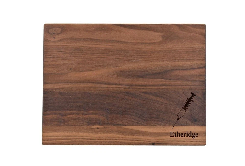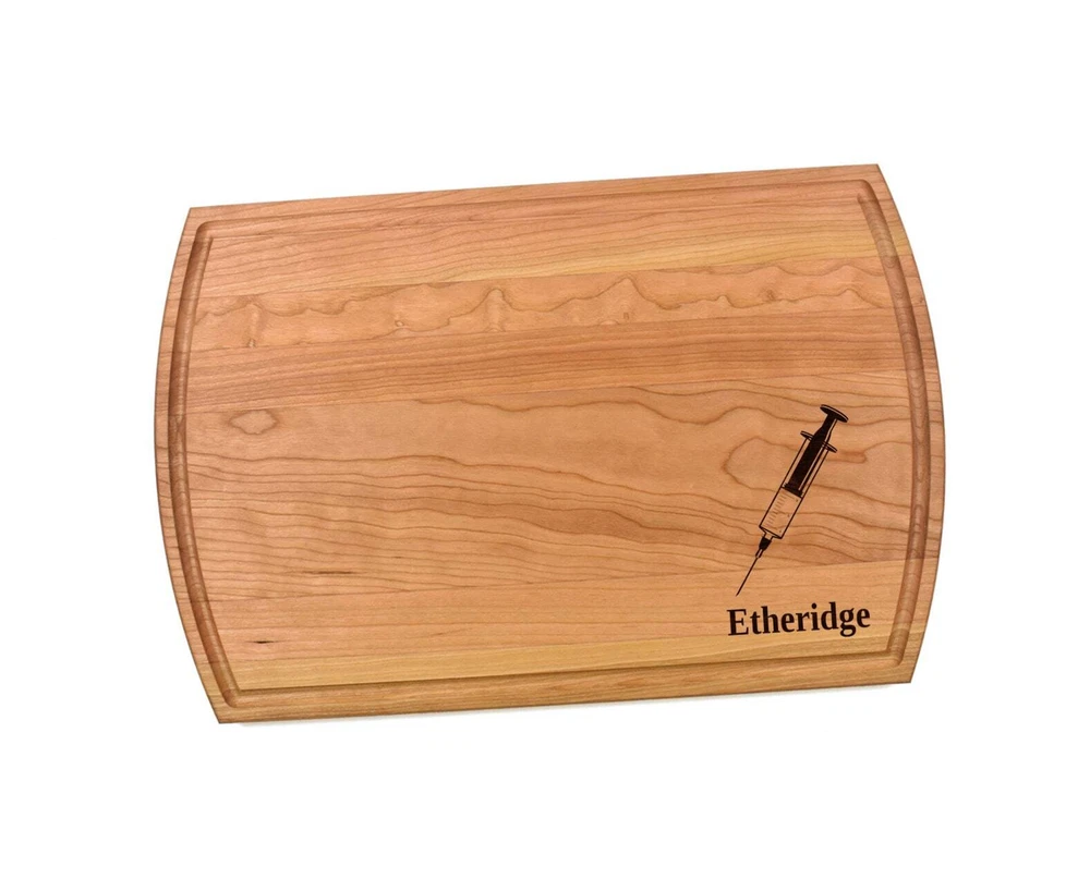 Design: Personalized Medical Shot Cutting Board or Charcuterie Serving Tray All items ship via USPS - please make sure your address is correct :-) Whether used as a charcuterie serving tray for snacks or cutting board, our bamboo, walnut and cherry custom boards are the perfect addition for the home and make the perfect gift for your loved one celebrating a birthday, anniversary, new home, wedding, etc! *** FEATURES *** • SIZES: We have multiple styles and sizes available. To see our current sizes available, click the drop-down menu. The photo slide contains a photo showing each side by side. Please note, the board with the juice groove only has the groove on the front side of the board. • THICKNESS: Bamboo Boards - Approximately 1/2" Thick; Walnut & Cherry Boards - Approximately 3/4” Thick • UNIQUE: Every board is unique with the grain and coloring varying throughout - no board is the same! • CARE INSTRUCTIONS: Hand wash only with warm water. Do not soak. Please apply mineral oil throughout the board’s life. • PERSONALIZATION/CUSTIMIZATION: Do you want the text placed differently on the board? Please don’t hesitate to contact us. All personalization notes can be entered in the personalization box when checking out. • SHIPPING: All cutting boards ship within 2 to 5 business days. • WHOLESALE ORDERS: Please don’t hesitate to contact us for information about wholesale orders. Processing times for larger orders may change. • NOTE: Colors can vary a bit on different monitors and screens. Any props included in photos are not included. Please be sure to double-check your address to make sure it is accurate for USPS delivery. If a package is returned to us due to an invalid address, the buyer is responsible for all additional shipping charges. We appreciate you supporting small business – best wishes! For items ordered with simple edits, we do not send proofs since the layout doesn't change from the example(s). However, in the event there are requests that change the layout from the example(s), we do send proofs for approval before making the product. If you'd like a proof before we make the product, please note so in the personalization box.