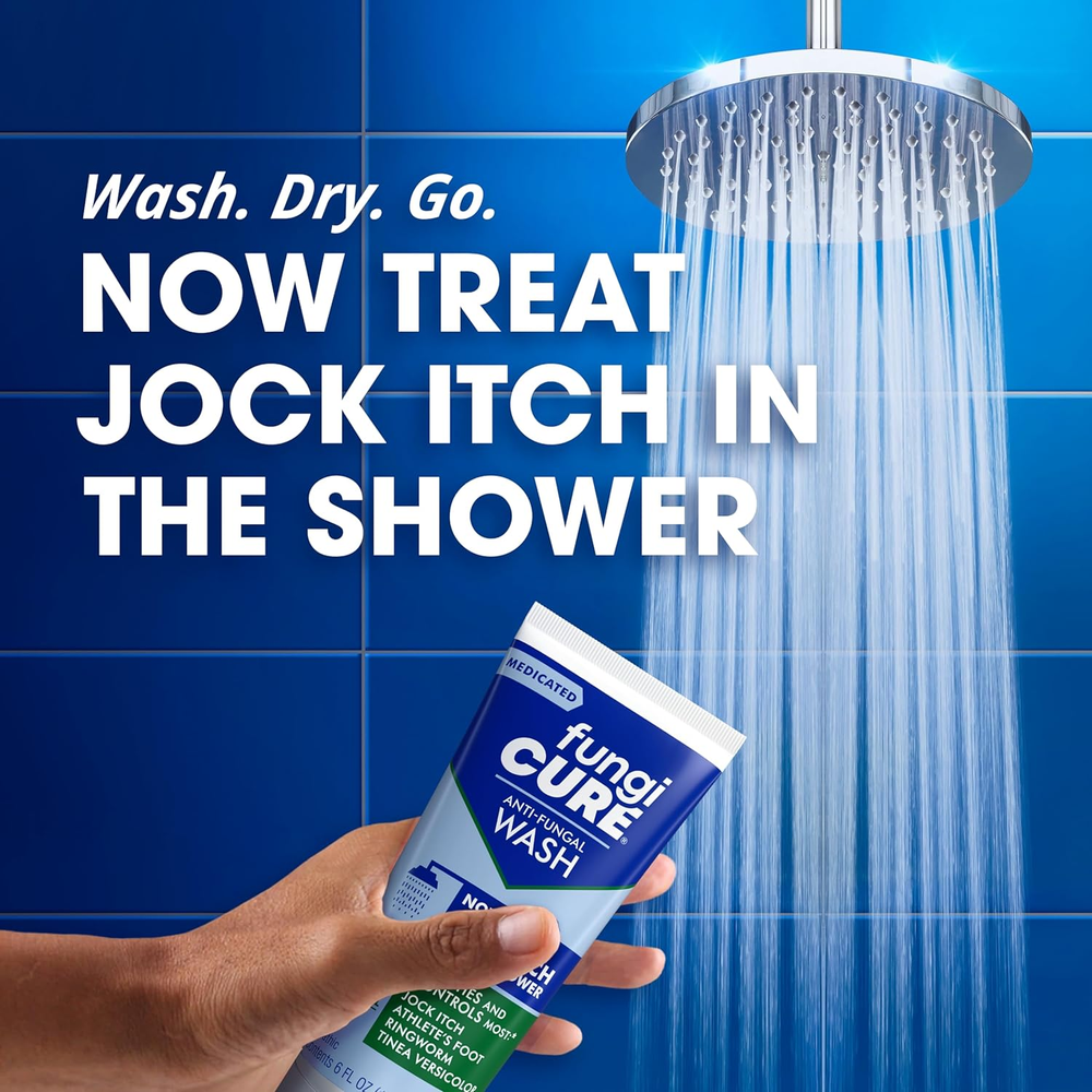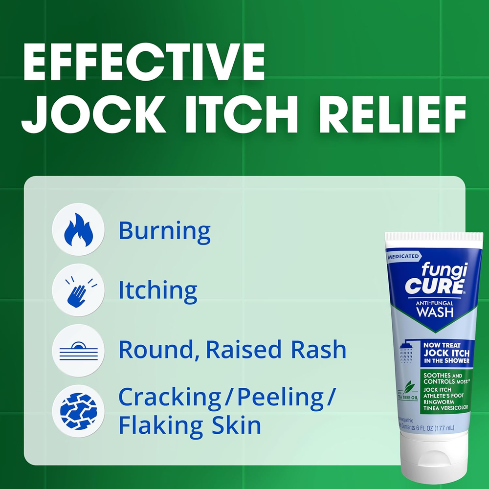 FUNGICURE Medicated Antifungal Wash provides convenient, effective treatment and relief right in the shower for most jock itch fungal infections FUNGICURE Medicated Antifungal Wash features the effective homeopathic antifungal ingredient Sepia 12x plus tea tree oil Wash the affected area with FUNGICURE Medicated Antifungal Wash as you normally would in the shower with any other body wash Regular use of FUNGICURE Medicated Antifungal Wash helps eliminate common fungus that can lead to jock itch FUNGICURE Medicated Antifungal Wash is also an effective treatment for most other common fungus infections like ringworm, athlete’s foot, and tinea versicolor It’s not you, it’s the fungus. Well, it’s you too, and you can trust medicated FungiCure Anti-Fungal Wash to conveniently treat most jock itch, ringworm, athlete’s foot, tinea versicolor and other common fungal infections of the body, hands, and feet while you shower. The itch happens. Thanks to FungiCure, it also goes away. Medicated FungiCure Anti-Fungal Wash lets you treat most jock itch conveniently in the shower without the mess and inconvenience of sprays, creams, and powders. Regular use of Medicated FungiCure Anti-Fungal Wash helps eliminate common fungus that can attach to healthy skin. Use it alone, or in combination with other treatments you’re currently using. Medicated FungiCure Anti-Fungal Wash controls most fungal skin infections including jock itch, ringworm, athlete’s foot, and tinea versicolor. Ditch the itch. Get relief with FungiCure.