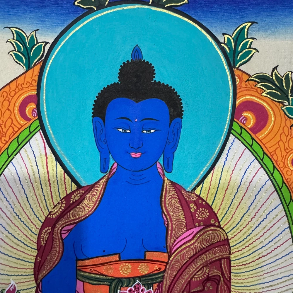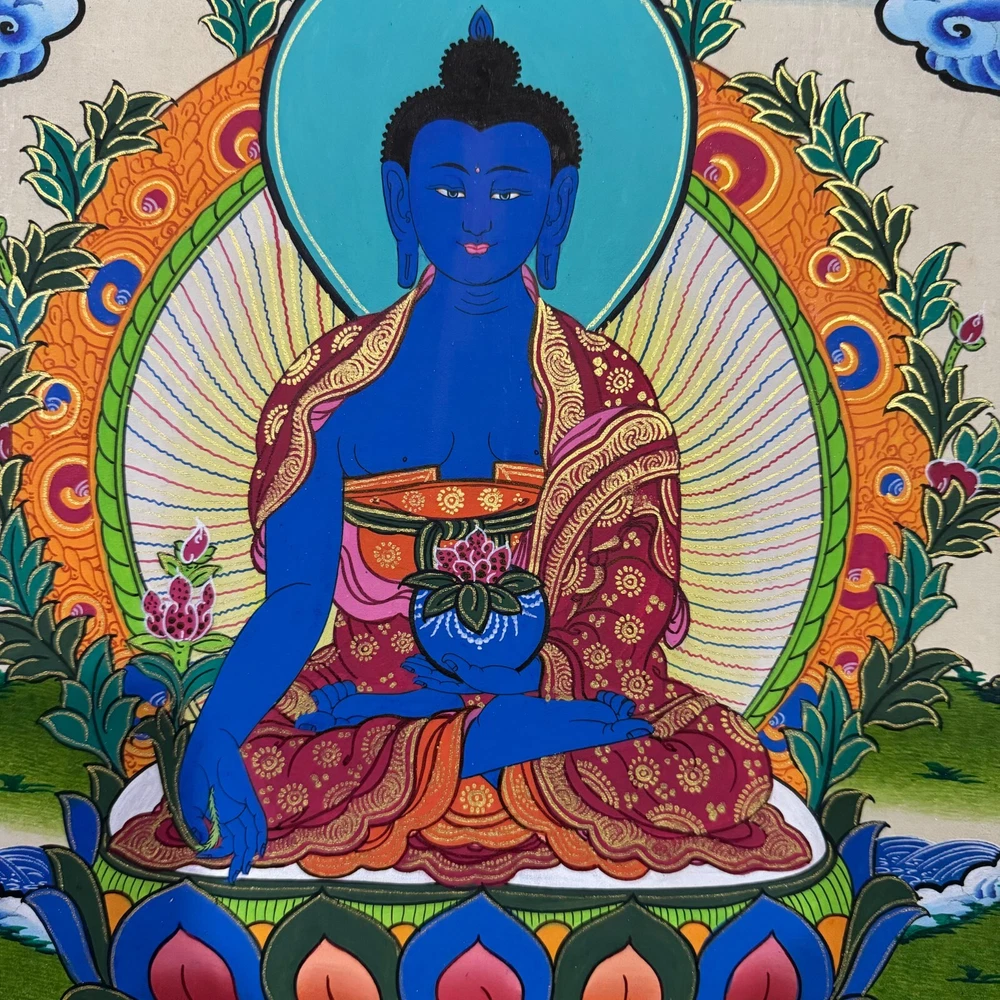 ******This is a thangka painting of Medicine Buddha is handmade in Nepal by a Lama artist****** ~Medicine Buddha~ He is also called the healing Buddha. He is said to dispense spiritual medicine when properly worshiped. It is even believed that an efficacio us cure may be accomplished by merely touching the image. He wears a monastic robe, is seated with the legs crossed. His left hand lying in his lap in meditation mudra, usually holds the medicine bowl, while the right hand in charity mudra hold either a branch with fruit or the fruit alone, of the myrobalan, as a medicinal plant. Size = 45 cm x 34 cm Material Used: • Cotton Canvas • Gold leaf • Natural Mineral and Pigments ~Excellent for meditation or home/office decor, ~Tibetan Yoga Wall Art ~Genuine 100% hand-painted from Himalayas Please feel free to contact me if you have any question regarding the painting.
