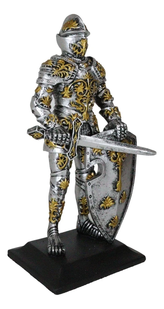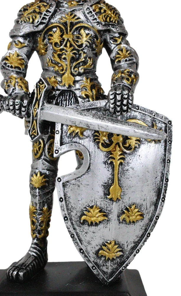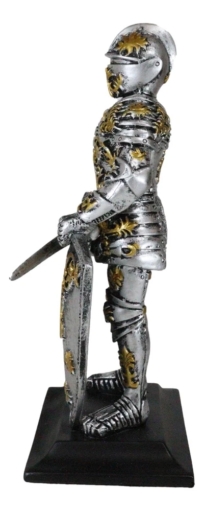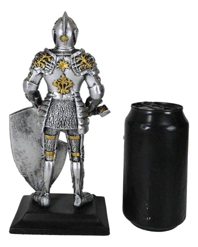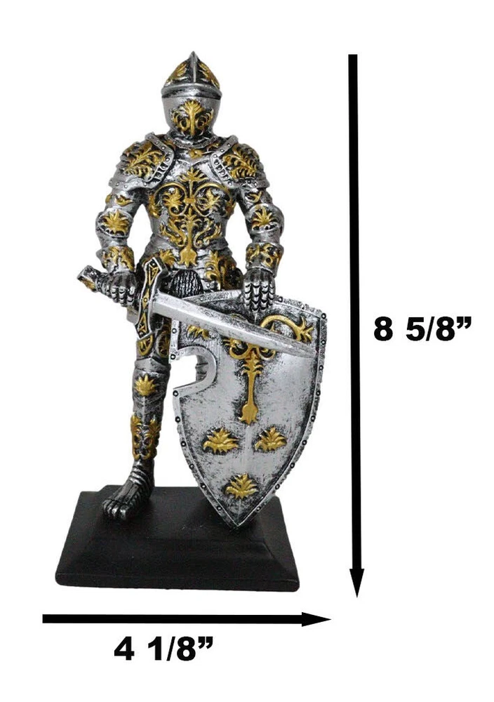 • This Roccoco Medieval Knight Figurine measures 8.5" tall, 4.25" wide and 3" deep approximately. It weighs about 1.25 pounds. • This Roccoco Medieval Knight Figurine is made of high quality designer resin. It is individually hand polished and painted. Because each piece is partially hand crafted, color tone may vary from pictures. • Decorate your home with this gorgeous chivalrous knight statue. He is fully armored, standing on guard with a long sword and large heraldry roccoco emblem shield. He will make a great gift to any medieval knight, crusader knights and renaissance art lovers. • Props in photos are not included with the item. They are meant to provide size perspective of the item(s). Ebros Medieval Swordsman Roccoco Italian Knight Figurine 8" Suit of Armor Coat Of Arms Video will open in a new window Using the mobile app? Copy this link into your browser: