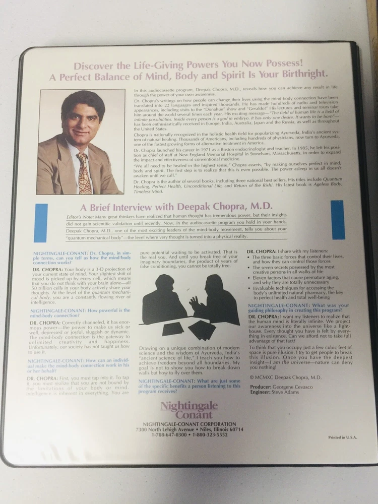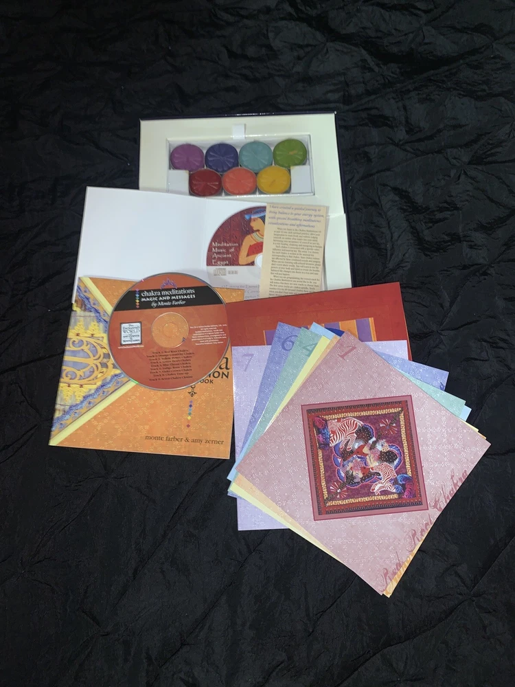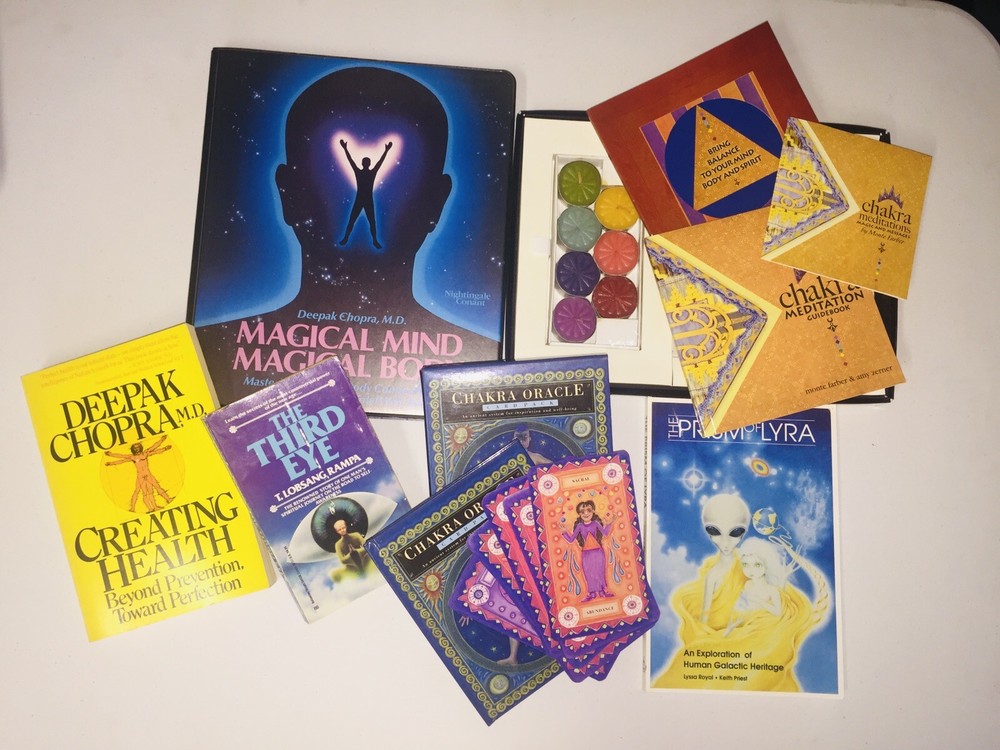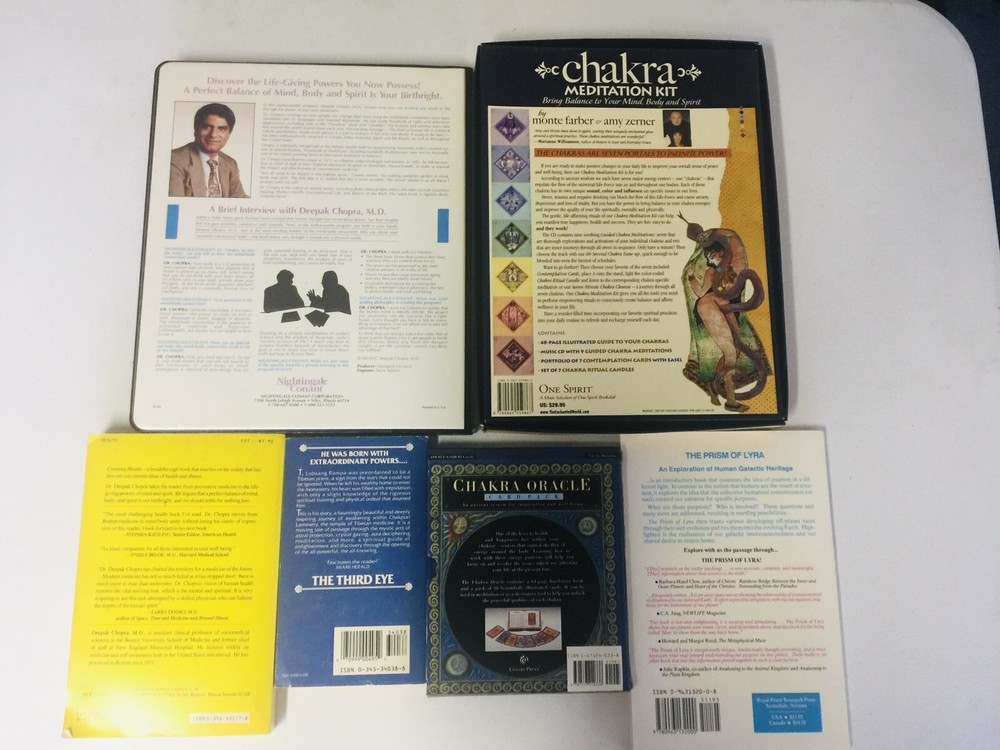 6 Piece Chakra Meditation Set, Oracle Cards, CD , Cassettes, Deepak Chopra & More. Condition is "New & Like New & Used ". This set Includes: 1- Deepak Chopra - Magical Mind , Magical Body This is in Like - New Condition : Magical Mind , Magical Body : This is a 6 Cassette Set for Mastering the Mind/Body Connection for the Perfect Health & Total Well- Being - 2- Chakra - The Meditation Kit - This is Brand New : 1- Illustrated Guide Book 2- Music CD 3- 7 Candles 4- 7 Contemplation Cards 3- Deepak Chopra -Creating Health - Beyond Prevention - Towards Perfection In Very Good Condition: Paperback Book - 4-The Third Eye , by Lobsang Rampa - Paperback - In Fair Condition - the book has some damage : Paperback Book 5- Chakra Oracle -Card Pack In New Condition : 64page Hardcover Book & a Pack of 30 Beautiful Illustrated 6-The Prism of Lyra New Condition : Paperback Book Shipped with USPS Media Mail. Track Page Views With Auctiva's Counter #meditationkit #DeepakChopra #OracleCards #chakra #magicalmind