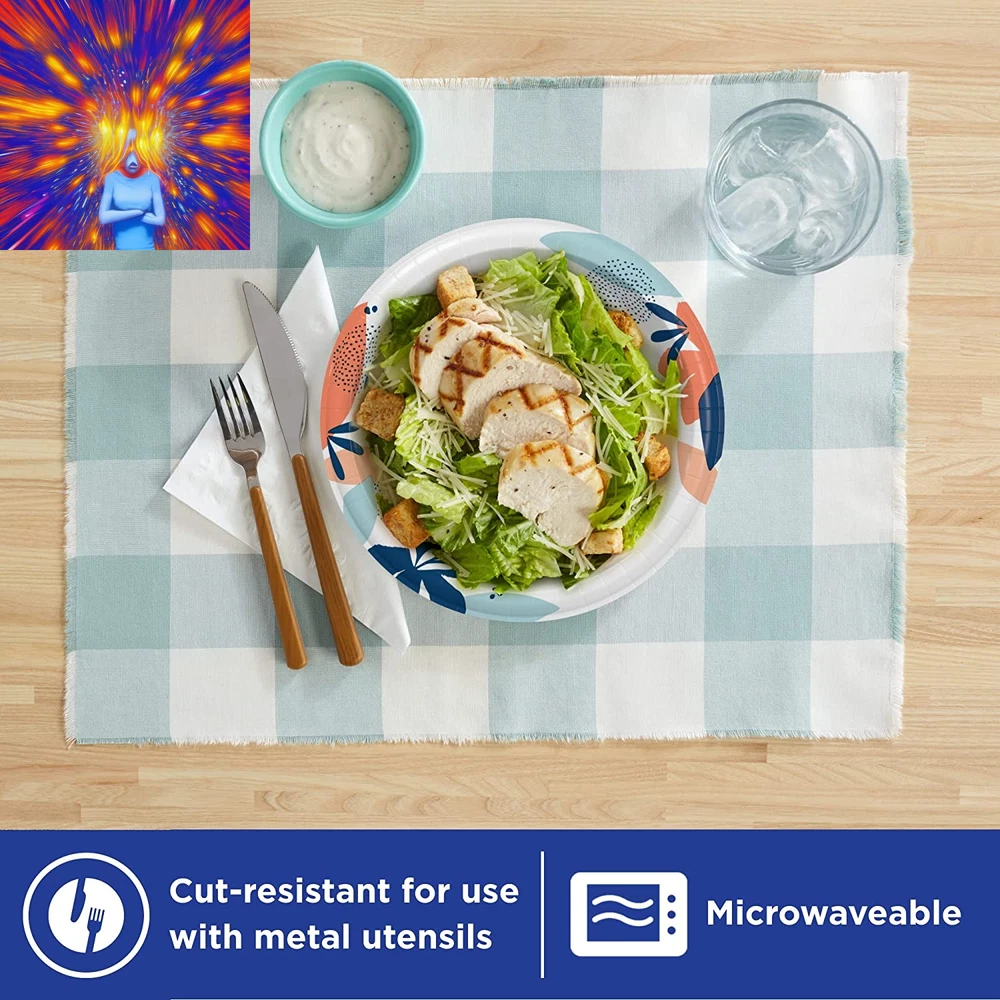 Special Feature: Disposable,Resistant Material Feature: Soak-proof Shape: Round Recommended Uses For Product: Salad Type: Does not apply Style: Modern Product Care Instructions: Hand Wash Only Material: Paper Pattern: Floral Batteries required: No Reusability: Disposable Is Microwaveable: Yes Diameter: 21.5 Centimeters Color: Multicolor Item Weight: 2.3 pounds Is Dishwasher Safe: No Product Dimensions: 8.58"L x 8.58"W x 4.18"Th Size: 90 Count (Pack of 1) Occasion: Picnic Number of Pieces: 90 Item model number: 10042000157381 Seasons: All Seasons Unit Count: 90 Count UPC: 744110459982 gtin13: 744110459982 Country of Origin: USA Product Name: Plate Brand: Does not apply