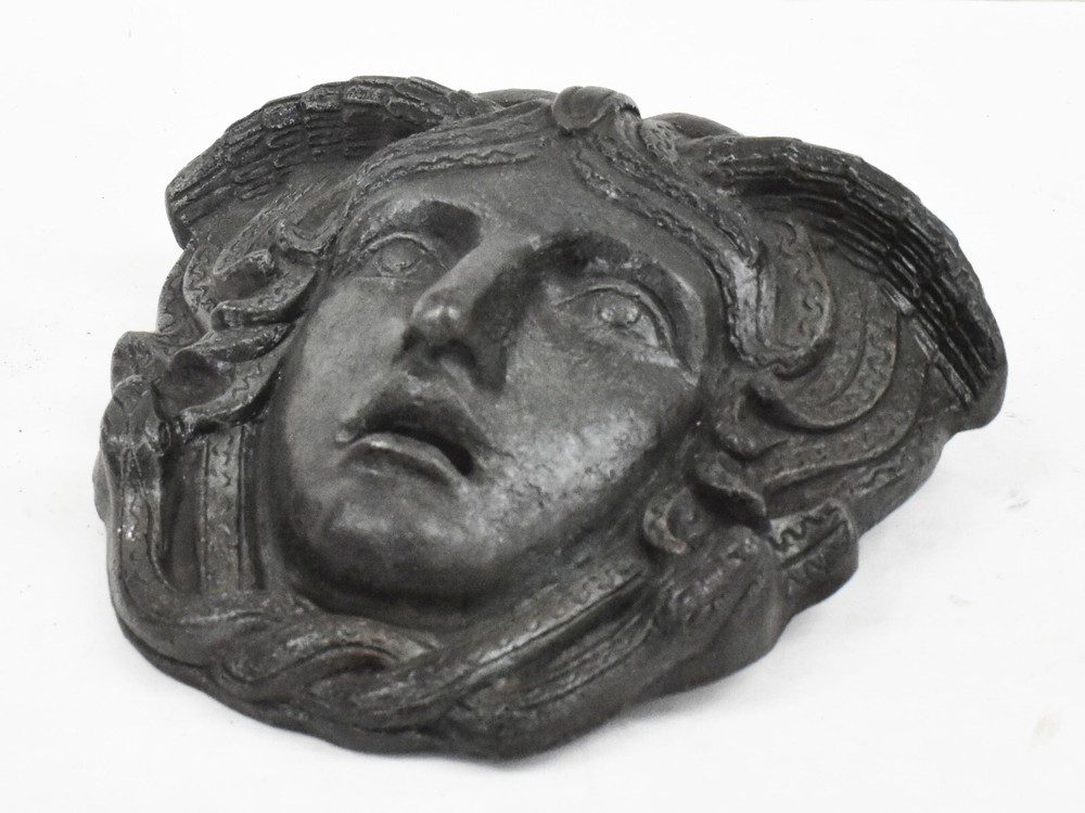 MEDUSA MINIATURE MASK In Greek mythology Medusa ("guardian, protectress") was a monster, a Gorgon, generally described as having the face of a hideous human female with living venomous snakes in place of hair. Gazing directly upon her would turn onlookers to stone. Most sources describe her as the daughter of Phorcys and Ceto, though the author Hyginus interposes a generation and gives Medusa another chthonic pair as parents. The mask was a necessary device for the ancient Greeks who developed the art of theater. Among the two main genres of Greek theater are comedy and tragedy, elements of which are still the fundamentals of all acting today. Masks such as this were important accessories in a number of ways. Primarily the mask provided colourful imagery as an accessory or prop (features were over-accentuated or made to look ridiculous in comedy much like caricature sketches). Secondly, using masks helped the audience to identify the roles as often a very limited cast were used to perform multiple characters. Thirdly and perhaps most importantly, the conical mouth shape of the masks (which were usually made of clay) helped the acoustics or 'volume' as the voice of the thespian was better projected out into towards the audience in the theater.(05-548-A) Details: Condition: New, Handmade in Greece Material: Casting stone Height: 13 cm - 5.1 inches Width: 13 cm - 5.1 inches Weight: 300 g ********