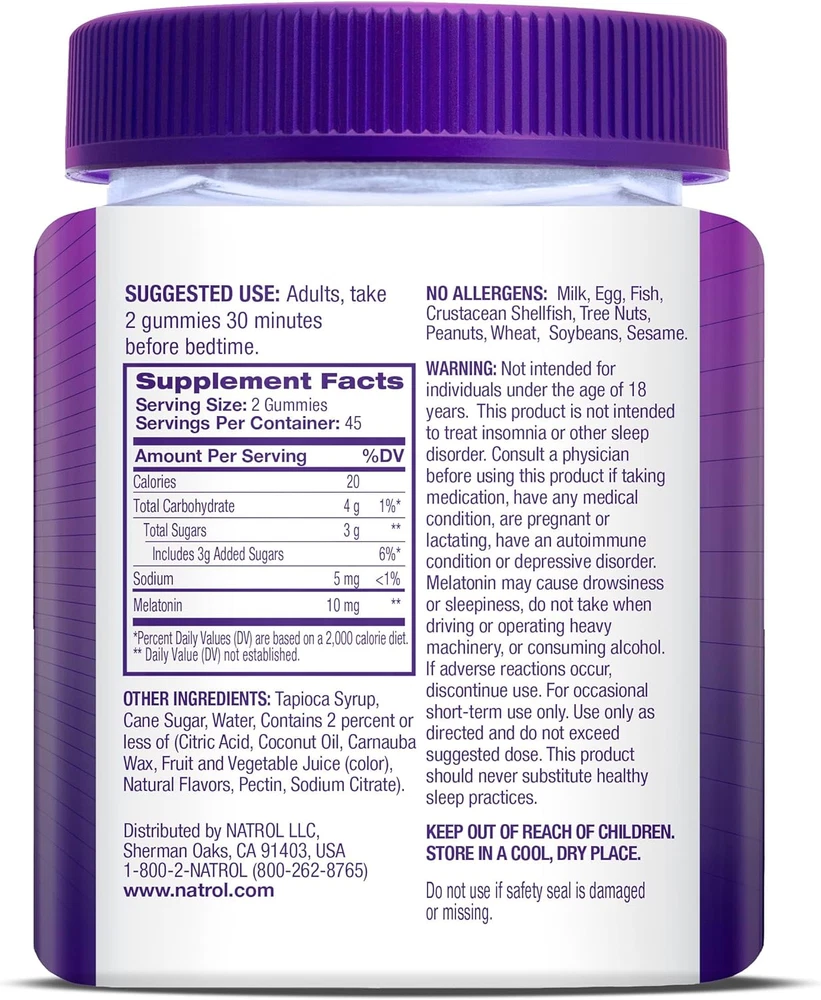FALL ASLEEP FASTER, STAY ASLEEP LONGER: Natrol melatonin promotes sleep in as little as 15 minutes(1) SLEEP SUPPORT: Natrol Melatonin Sleep Support gummies for adults help you fall asleep faster, stay asleep longer, and wake up feeling refreshed and ready to take on the day ahead(1) 100% DRUG-FREE SLEEP AID SUPPLEMENT: These melatonin gummies for adults are 100% drug-free and non-habit forming, vegetarian, gelatin-free and do not contain synthetic dyes, artificial flavors and sweeteners DELICIOUS TASTING GUMMIES: Pectin-based adult melatonin gummies feature a delicious strawberry flavor and have a soft texture that’s easier to chew than standard gelatin gummies, making them easy and delicious to take #1 DRUG FREE SLEEP AID BRAND IN AMERICA(2): As the #1 drug free sleep aid brand, we not only have formulas to help you fall asleep faster, we also offer fast-acting and effective formulas that can help calm your mind and body and maintain good health Natrol Melatonin 10 mg gummies are sleep support for adults and offer a convenient and easy-to-take options to help with occasional sleeplessness but prefer not to take tablets.(1) This melatonin sleep aid is 100% drug-free, made with clean ingredients, no synthetic dyes, artificial flavors or sweeteners. Each vegetarian, non-GMO and gelatin-free melatonin sleep aid gummy excludes common food allergens. Factors like stress and screen time before bed can interrupt melatonin production and disrupt your sleep. Natrol melatonin supplements for sleeping offer 10 mg of 99% pure melatonin per serving, providing the sleep support you need to fall asleep faster and stay asleep longer.(1) Natrol's pectin-based formula and great-tasting strawberry flavor make these sleep aid gummies easier to chew than standard gelatin gummies. Adults, take two gummies 30 minutes before bedtime. Natrol is dedicated to creating innovative, quality products, to help you maintain good health and thrive in your busy, modern lifestyle. (1)These statements have not been evaluated by the Food and drug administration. This product is not intended to diagnose, treat, cure or prevent any disease.