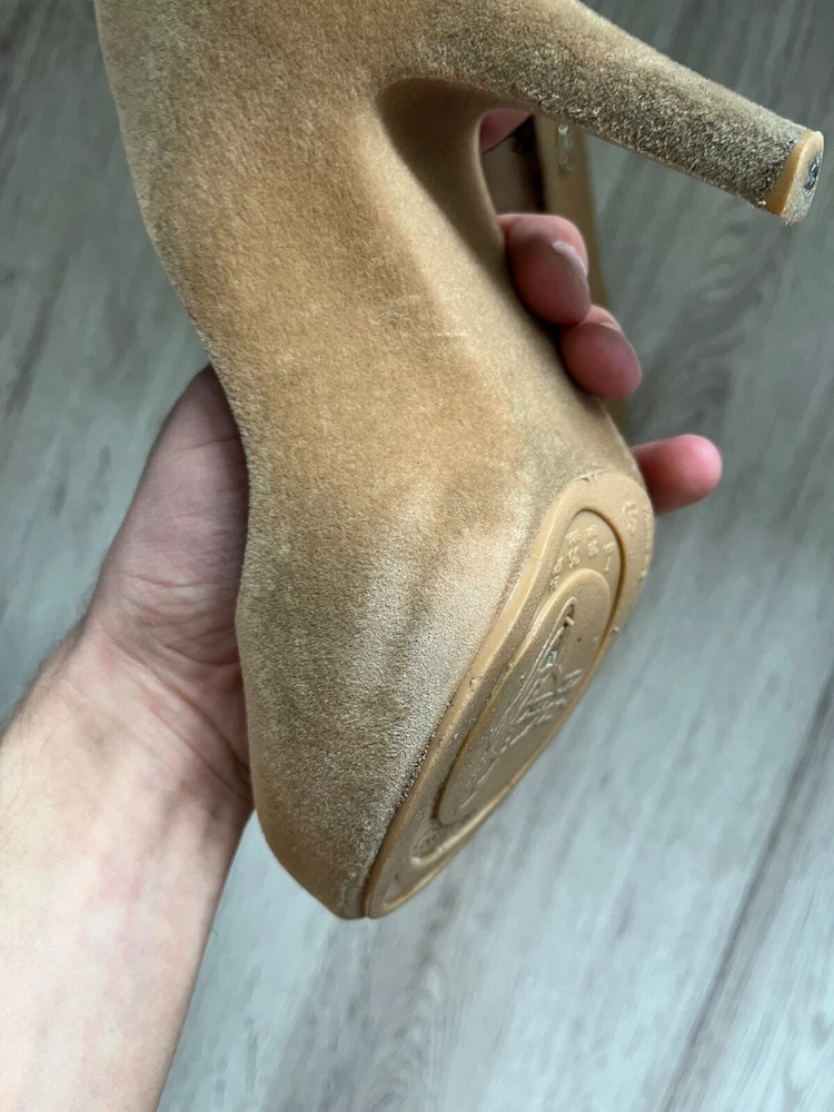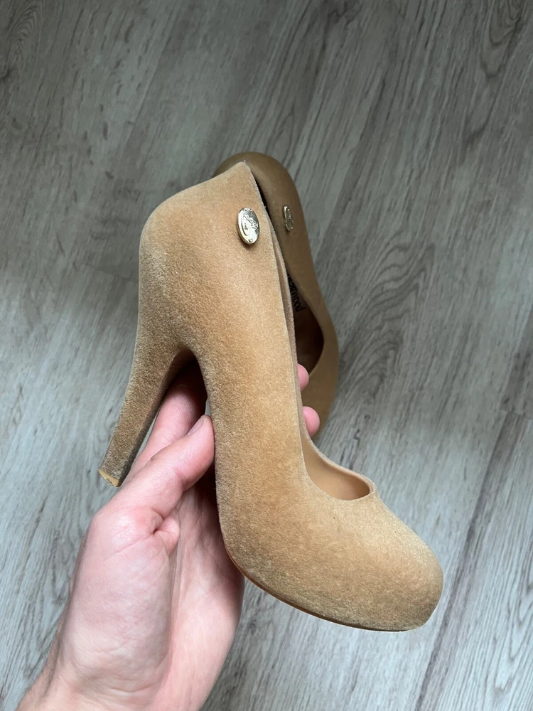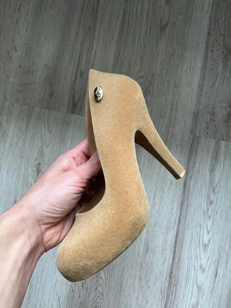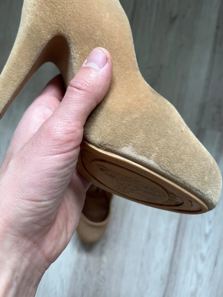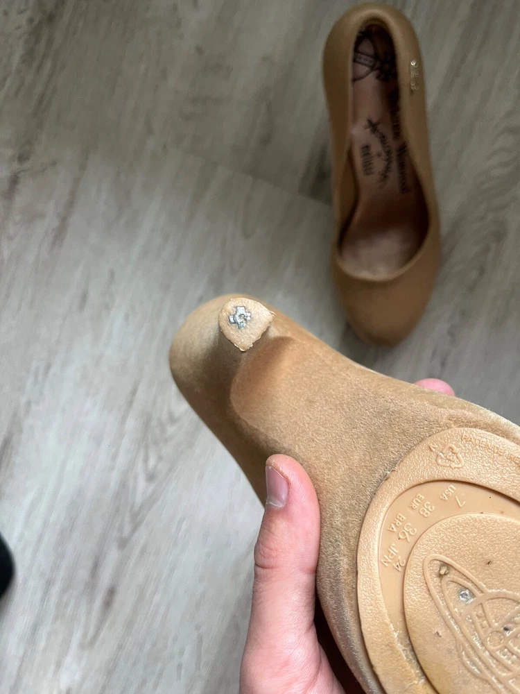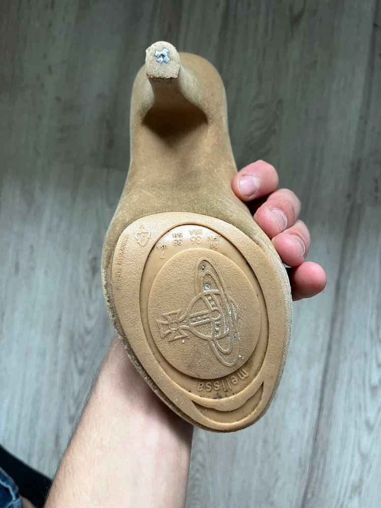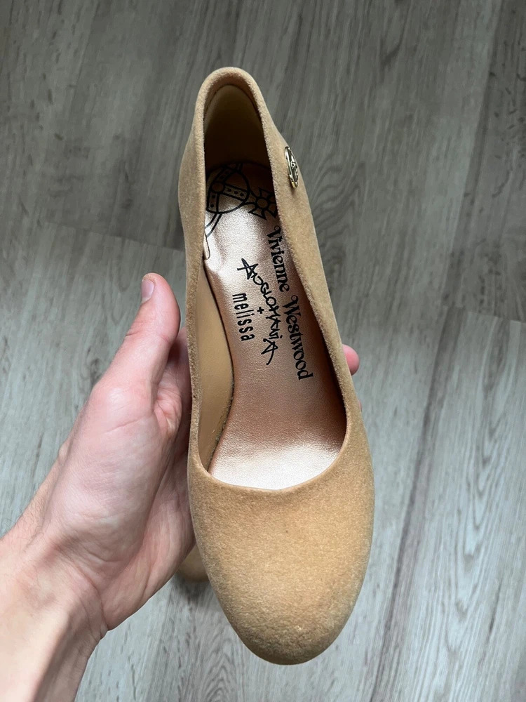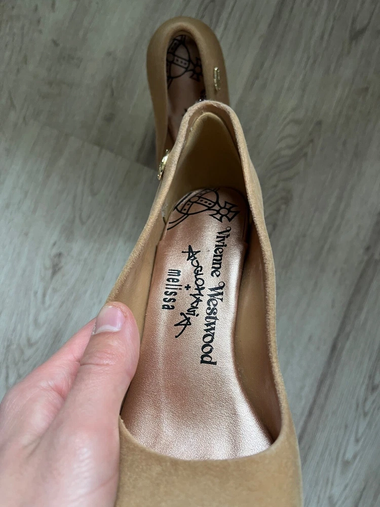 Elevate your shoe game with these stunning Vivienne Westwood flats. The melissa velvet effect rubber shoes in a beautiful beige color are perfect for any occasion. These women's shoes are made with high-quality materials and are designed to provide comfort and style. The shoes are a US size 7 and are perfect for those who love flats. Add these shoes to your collection today and step out in style.