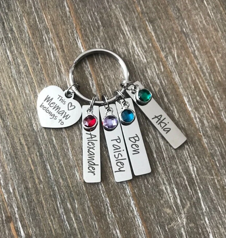 Listing is for Completed custom Name Keychain, Keychain includes heart charm with your choice of wording ( Up to 24 Characters ) and custom Bar Name charms with your choice of Names engraved ( up to 11 characters, capital letters count as 2 characters each ) and birthstones. Custom bar charms are 1 1/4" Stainless Steel heart charm is 3/4 Stainless Steel Key ring is 1" Stainless Steel Keychain will come in Gift box ready to Gift :) *IMPORTANT* Please be sure to include Names and Birth months in notes to seller during check out or in messages, if wording not requested this will come with This Memaw belongs to :) Stainless Steel doesn't need polished, will not tarnish and doesn't stain the surrounding skin. It's properties are hypoallergenic for those with metal allergies. Please be sure to check messages after purchase in case of any questions I may have so your order is not slowed :)