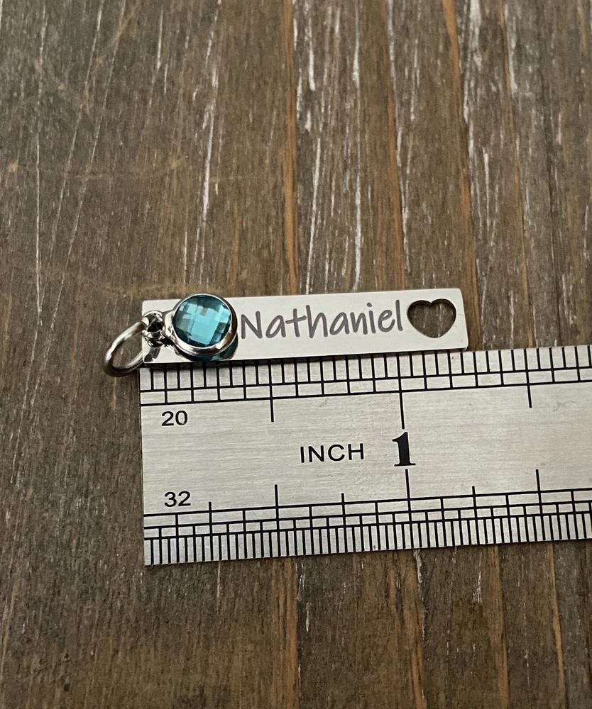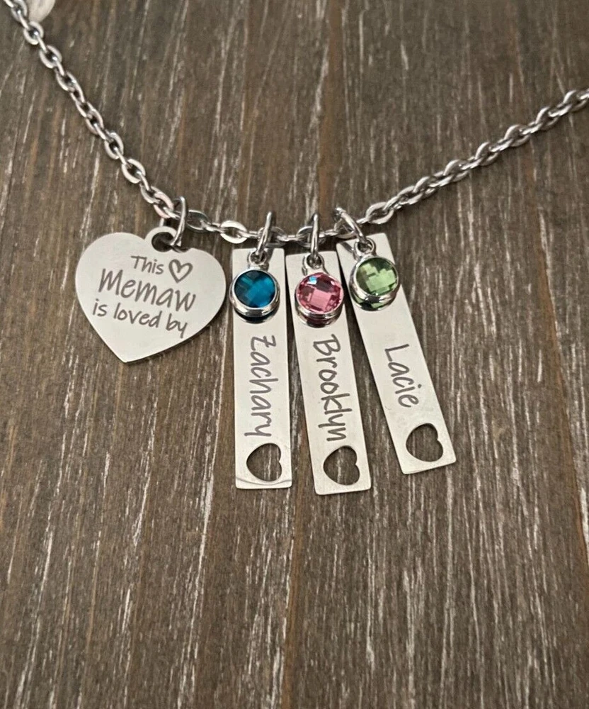 Listing is for Completed custom Name Necklace Necklace includes Heart charm with your choice of engraving ( up to 24 characters ) and custom cutout heart Bar Name charms with your choice of Names ( up to 10 characters, capital letters count as 2 spaces ) and birthstones. Chain is 18" Stainless Steel. I do also have 24" available upon request. Custom bar charms are 1 1/4" Stainless Steel Heart charm is 3/4 Stainless Steel Necklace will come in Gift box ready to Gift :) *IMPORTANT* Please be sure to include Names and Birth months in notes to seller during check out or in messages :) If requests not left for heart this will come as This Memaw is loved by :) Stainless Steel doesn't need polished, will not tarnish and doesn't stain the surrounding skin. It's properties are hypoallergenic for those with metal allergies. Please be sure to check messages after purchase in case of any questions I may have so your order is not slowed :)