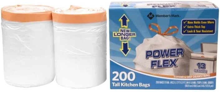 Member's Mark Power Flex Tall Kitchen Drawstring Trash Bags 13 Gallon