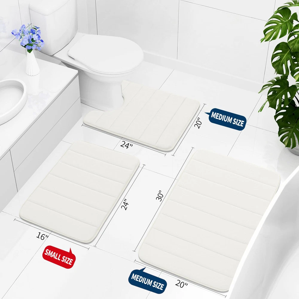 Set of 3 Bath Rugs: 1 Small Bath Mat 24"x 16", 1 U-Shaped Contour Mat 24”x 20”, 1 Large Bath Mat 30”x 20”. These Luxurious bath rugs decor your home and give your bathroom a new look Non-slip and Absorbent: The bathroom rugs set backing are reinforced with non-slip PVC dots texture design to helps to stop shifting and keeps the mat in place. And the cozy plush microfiber absorbent water well, after you shower and standing on the mat, water will be absorbed quickly. WARNING: Place mat on CLEAN DRY SMOOTH FLOOR only. Water under bath mats can cause it to slip. Keep bottom of mat dry. Before using bath carpet, test with foot to ensure it doesn't move Soft Memory Foam: The bath mats set are filled with soft and comfortable polyurethane memory foam and the microfiber coral velvet outer material, soft and cozy, giving you unique added support to help eliminate pressure on your feet Machine Washable & Dryable: Machine wash in cold water. Do not use chlorine or bleach. Tumble dry on low heat or lay to air dry, the memory foam bath mat dries exceptionally fast. Color will stay nice and vibrant no matter how many times they’ll be washed and dried Remove the Crease: Our bath mat is packaged using our innovative rolled packaging method. To effectively remove the creases, please follow these steps: 1. Place a damp towel over the folded sections of the bath mat; 2. Gently press and move the iron across the mat periodically. This process should significantly reduce the creases, Once the creases are minimized, the bath mat can be placed anywhere in the bathroom