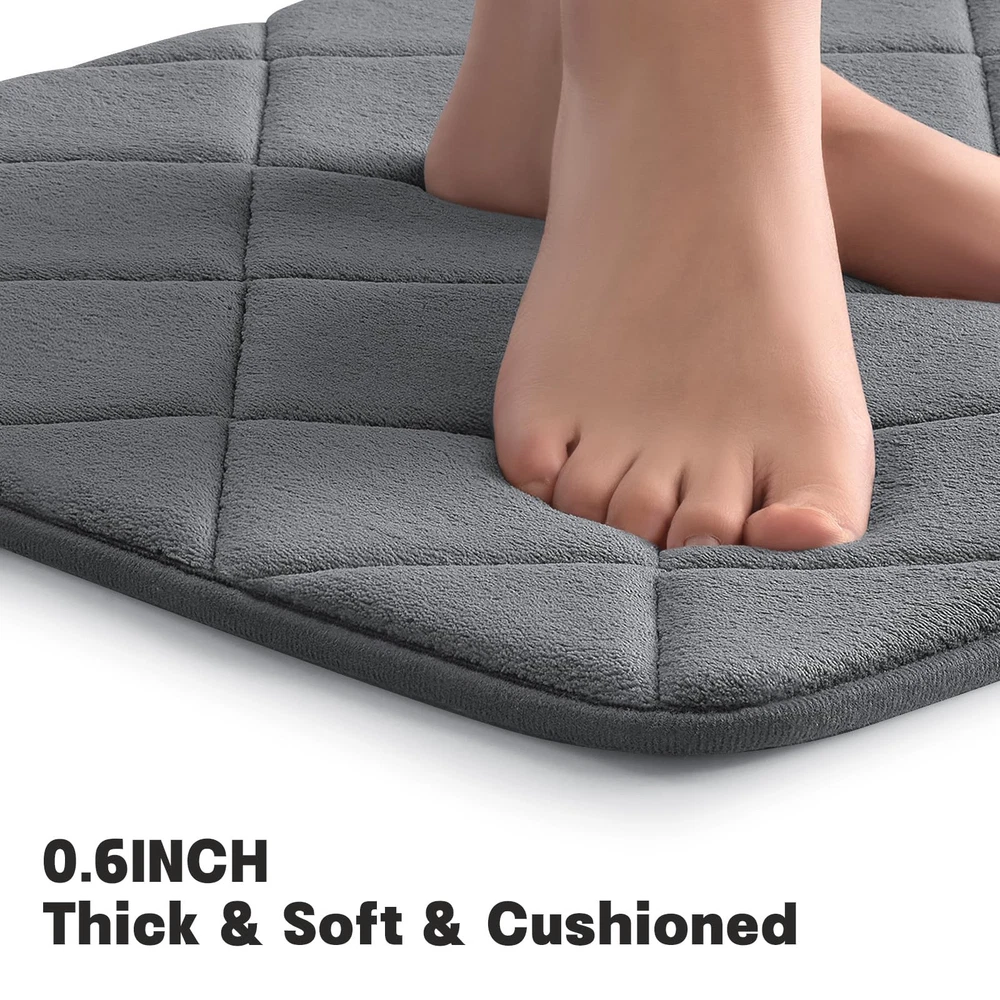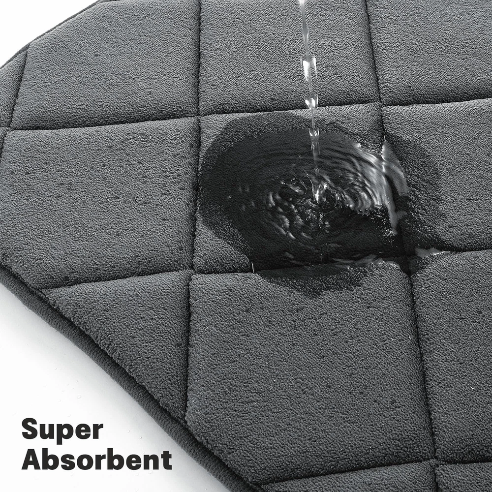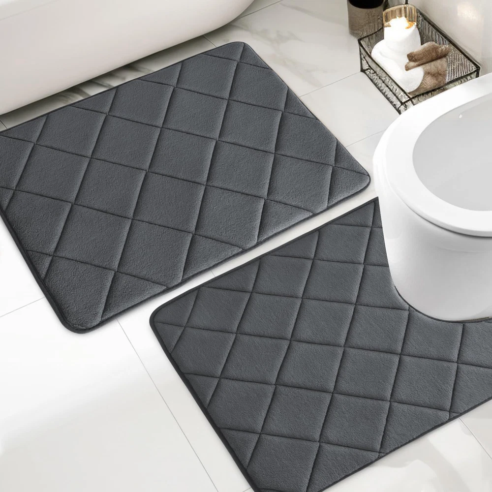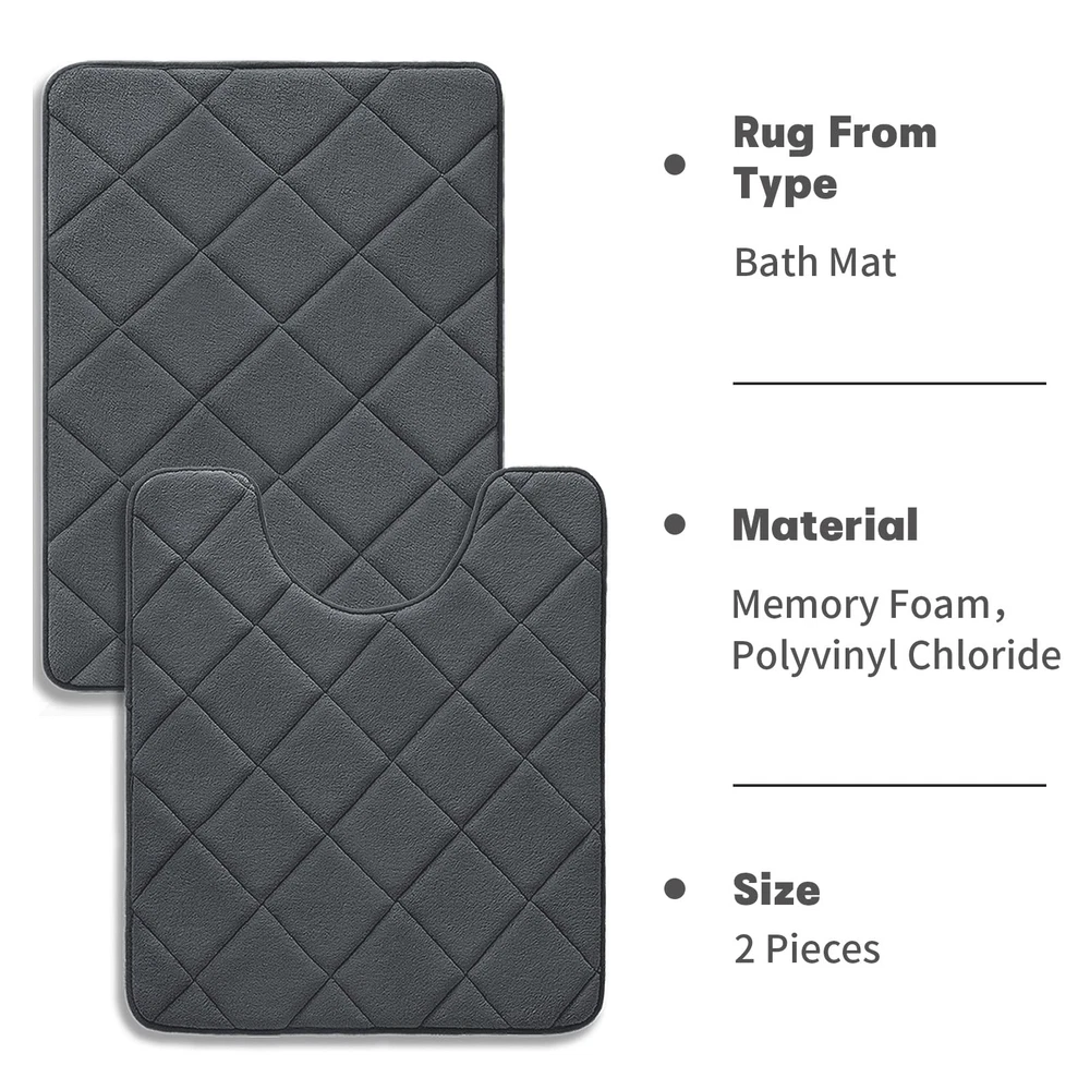 Welcome to Store! 【Bathroom Rugs Sets 2 Piece】Includes toilet rugs u shaped washable 24'x20' and 17 x 24 bath mat. Bathroom rug set can be used by the tub, in front of the sink, on the vanity, or in the living room 【Super Soft and Comfortable】memory foam bath mat set is made of 40D high-density memory foam, providing softer support for your feet and better protection for your knees from cold floors 【Water Absorbing Bathroom Mats 2 Piece】Dense holes in the memory foam bathroom rug set push airflow across the surface for fast water absorption; Keeps floors dry when you step out of the tub, shower or at the sink and keeps drips from messing up your bathroom 【Non Slip Bath Mat】This bath mat rug has a PVC non-slip backing for a stronger grip to help prevent movement and slipping. A safe barrier for the elderly and children after bathing 【Easy To Clean】 Machine wash in cold water and mild detergent (no chlorine or bleach), tumble dry on low speed or hang to dry. The material is durable and will retain its color after repeated washing and drying