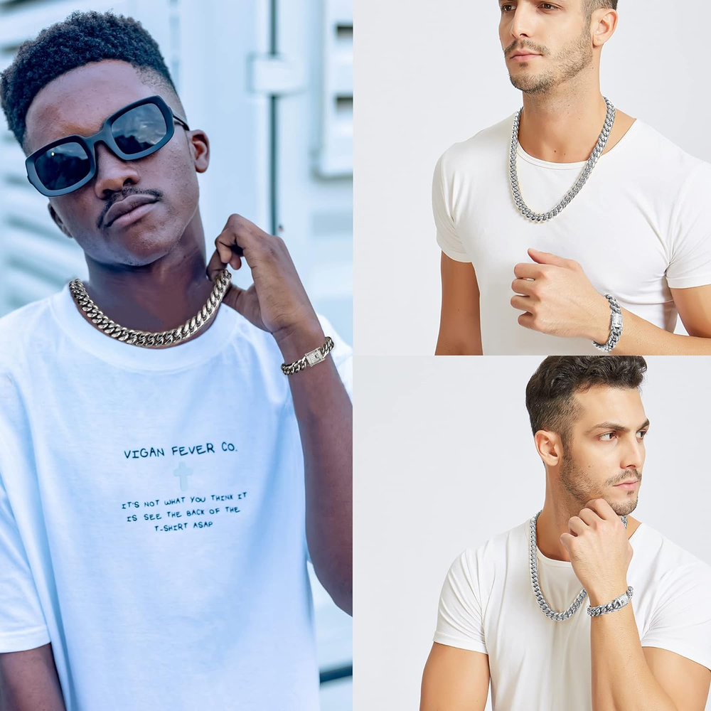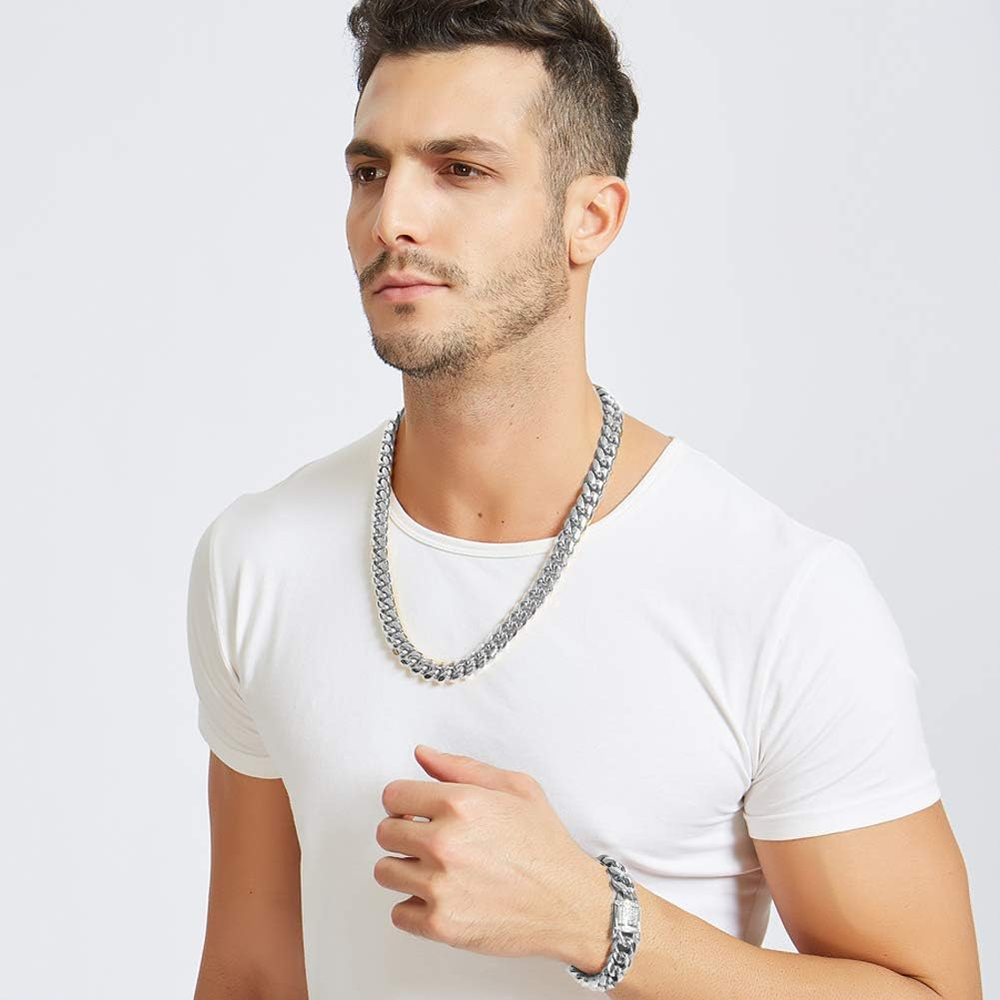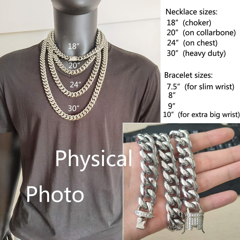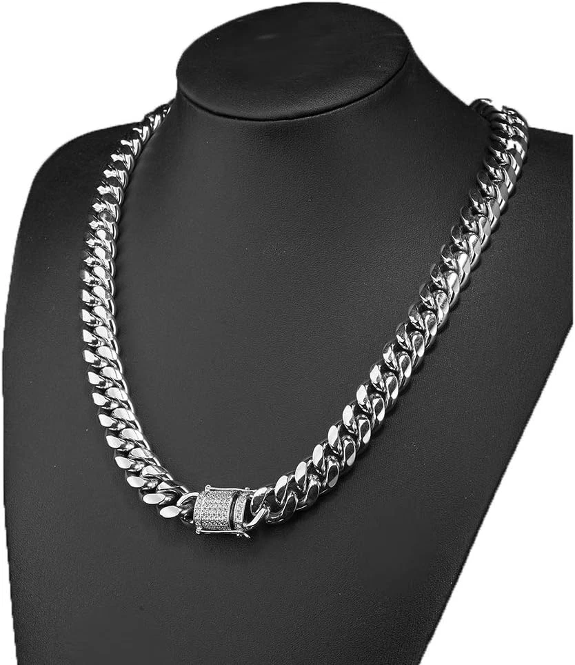 Mens Miami Cuban Link Chain White 15mm Stainless Steel Curb Necklace with cz Diamond Chain Choker Product Description Detail About the stainless steel The metal material is 304 stainless steel,which is used in food supply industry. Never rust,it can be in the swimming pool,but you'd better not to grind the gold plating layer. Cubia Zirconia AAA+ Cubia Zirconia Shine like diamonds. Packed in a pretty box ,a great gift for your freinds ,Lover,family or yourself. Style Necklace Metal stamp Stainless Steel Chain Curb Material Stainless Steel, Cubic Zirconia Metal Stainless Steel Model number Cuban Link Chain Gold CZ Length 20 inches Item Display Length 20 Inches Department mens Is Discontinued By Manufacturer No Package Dimensions 3.3 x 3.3 x 1 inches; 4.3 ounces Clasp Double locking fold-over 3.3 inches x 3.3 inches x 1.0 inches. Weight: 4.3 oz Shipping from the USA All of our products are shipped from the USA, ensuring quick delivery to your destination. Payment We offer the following payment methods: PayPal, credit card, bank transfer, and eBay's secure payment system. Free Shipping & Free Returns Shipping within the USA is FREE. Additionally, any return is absolutely free for you. Risk-Free Purchase You have the option to return an item within 30 days without any justification. We cover the return shipping costs! Fast Shipping We ship immediately upon receipt of payment. Generally, the package is delivered within 2-3 days in the USA. If it takes longer, we will contact you. Quality and Costs Made in Europe, USA, China No customs fees or additional charges Total satisfaction guarantee Invoice with declared VAT available upon request in .pdf format Feedback Your feedback is very important to us. After you pay for your purchase, you will automatically receive positive feedback from us.