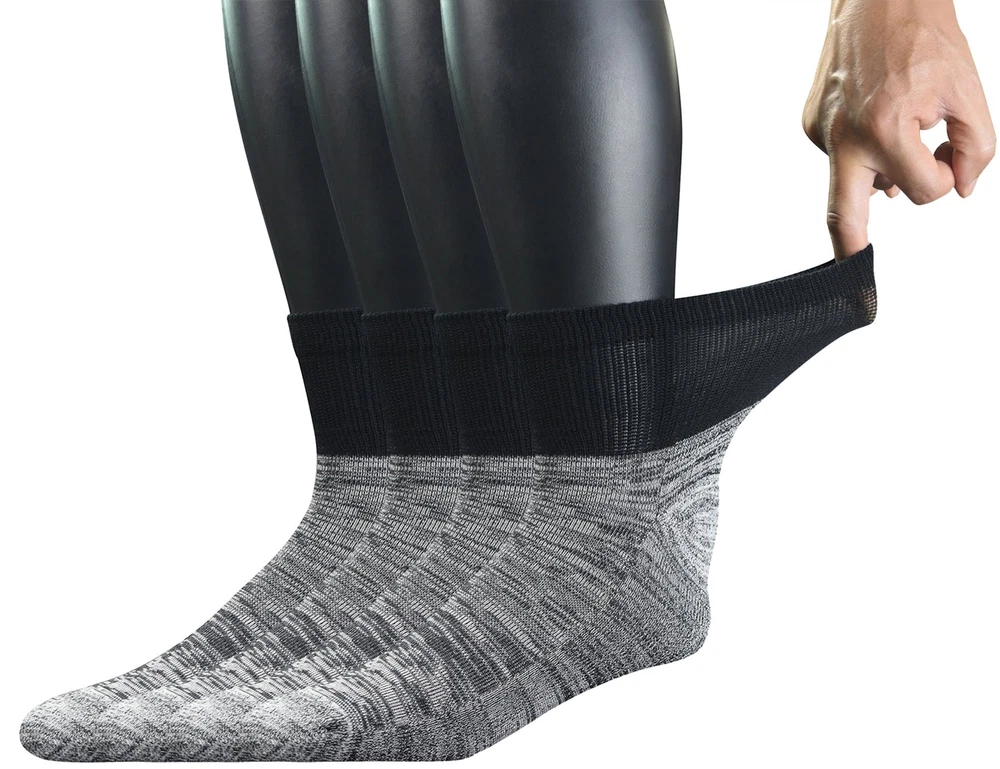 diabetic socks are made of breathable bamboo blend combed cotton material for the finest fit and comfort.The socks have extra padding, which can help patients who are at risk of developing ulcers and keeping the foot dry, feeling fresh and healthy. Traditional socks contain prominent seams, especially in the toe area could cause irritations to form in a diabetic's foot, however, diabetic socks are completely seamless. The tops of diabetic socks are also designed to be non-binding which means the socks will not have a tight-fitting elastic band to prevent slippage like traditional socks.This allows for better circulation in the legs, one of the first areas damaged by uncontrolled high blood sugar levels. Bamboo fiber is a new and environmental fiber, which can become more stronger, after blend with cotton fiber. Bamboo fiber has excellent soft touch and draping, resilience and abrasion resistance than viscose fibers. 4 Pairs socks contains,each pair of socks is made with high quality and then carefully inspected to offer the customer the finest possible quality. In a word,the diabetic socks suits for those who have high demand for comfort, especially particular people like diabetes and the elderly. Seamless toe eliminates bulky toe seam ,reduce the risk of infection, foot pressure, blistering Non-binding loose fitting stay-up top and large wide calf wont restrict circulation Reinforced heel and toe,extra cushioning through sole for added comfort and protection;Much more comfortable and durable than normal diabetic socks Engineered knit-in mesh on top provides breathability and moisture management 4 Pairs;Suits for those who have high demand for comfort, especially particular people like diabetes and the elderly