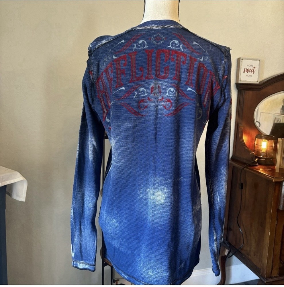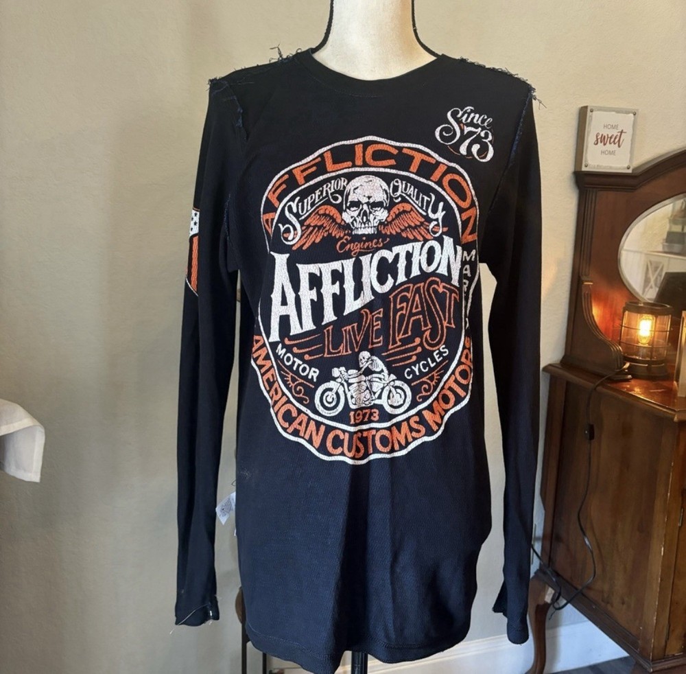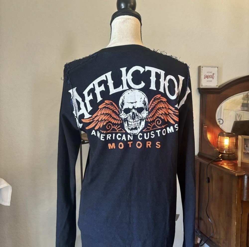 Men’s affliction reversible thermal long sleeve. Really cool graphics on both sides. Not new with tags but new with sticker. Size small.
