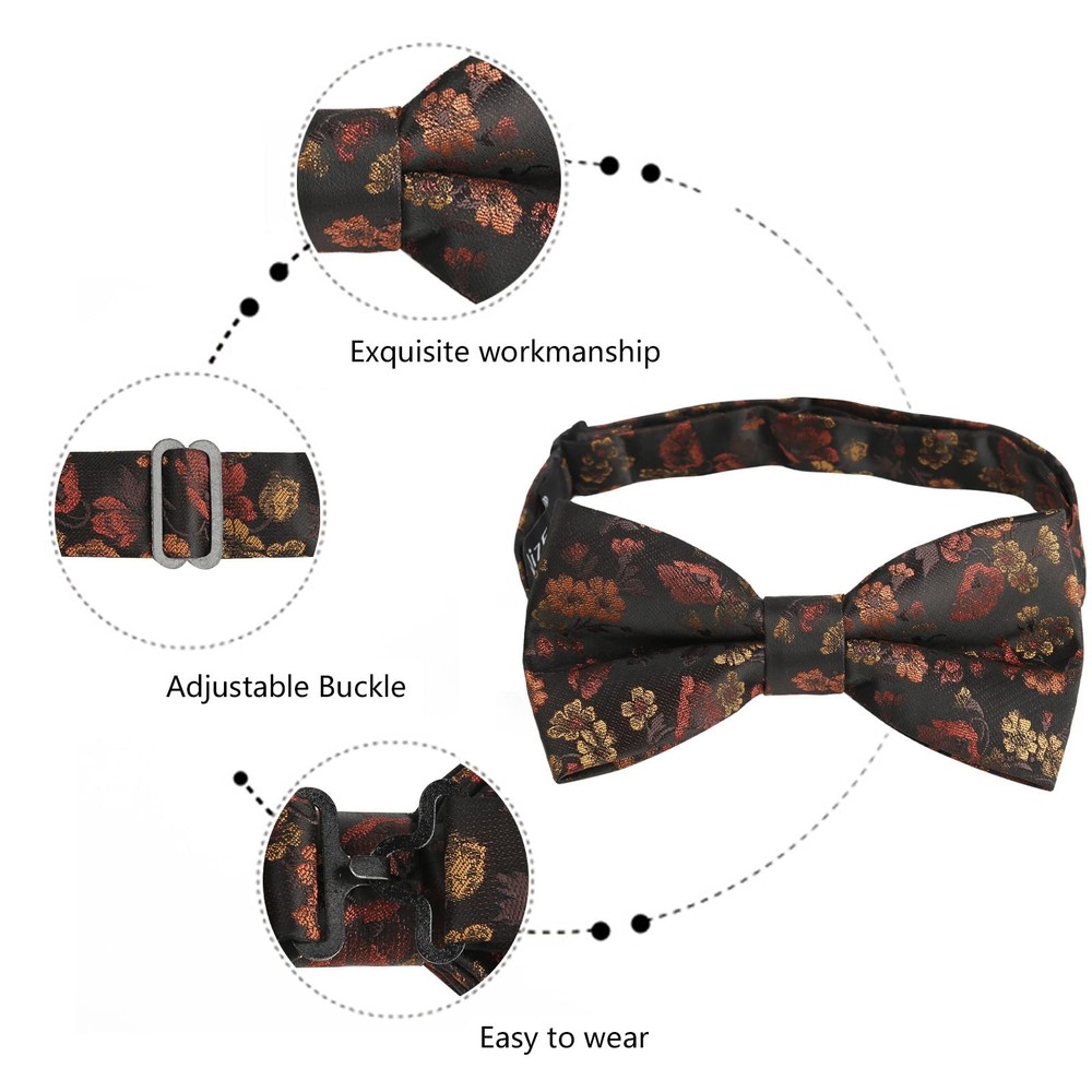 Mens Pre-tied Bow Tie, Pocket Square and Cufflinks Set Would make a perfect gift for Christmas/Birthdays/Anniversaries/Fathers Day/Businessman/Bridegroom. All items are guaranteed brand new. For quality control purposes, we checked all the items one by one. If you have any questions, please feel welcome to contact us. Fabric: 1OO% Polyester, glossy and comfortable to wear Package includes: 1*Pre-tied Bow Tie (4.7*2.5inches/12*6.5cm) , 1*Pocket Square (9.5*9.5inches/24*24cm) and a pair of Cufflinks in a gift box Design: a floral design with the beauty of spring on this tie set; elegant and bright; with a handkerchief in the same colour to give you a formal and perfect look Occasion: Elegant flower patterned bow tie set is suitable for many occasions, such as banquet, wedding, anniversary, party, birthday, etc. Suitable for all seasons, especially warm spring days Washing instructions: Machine wash gently. Or hand wash in water below 40 degrees