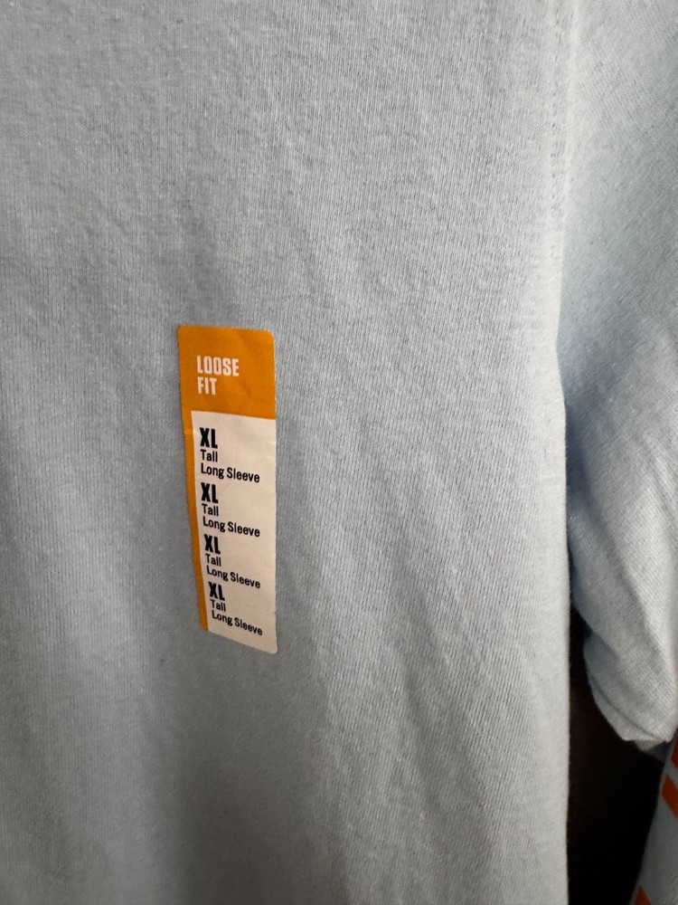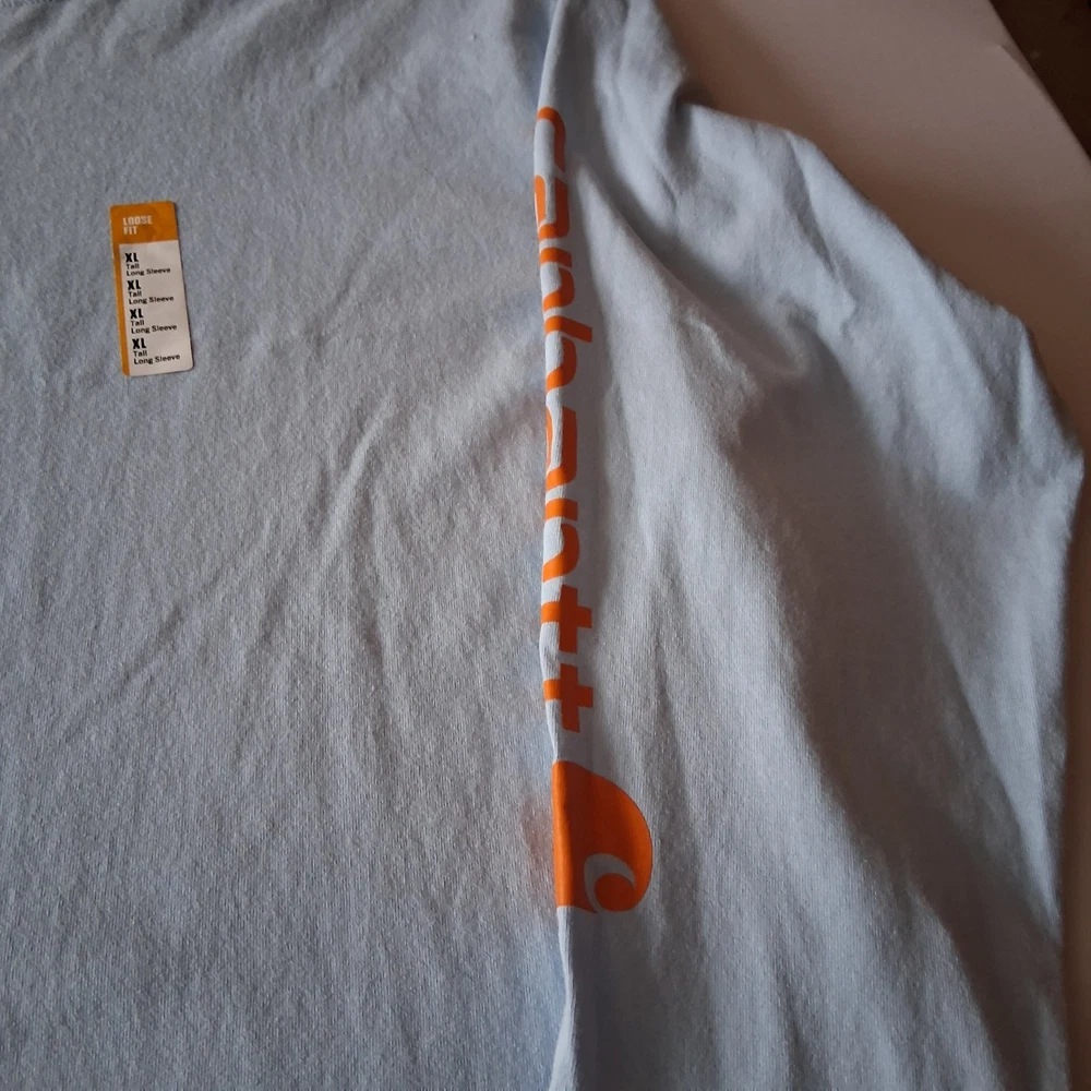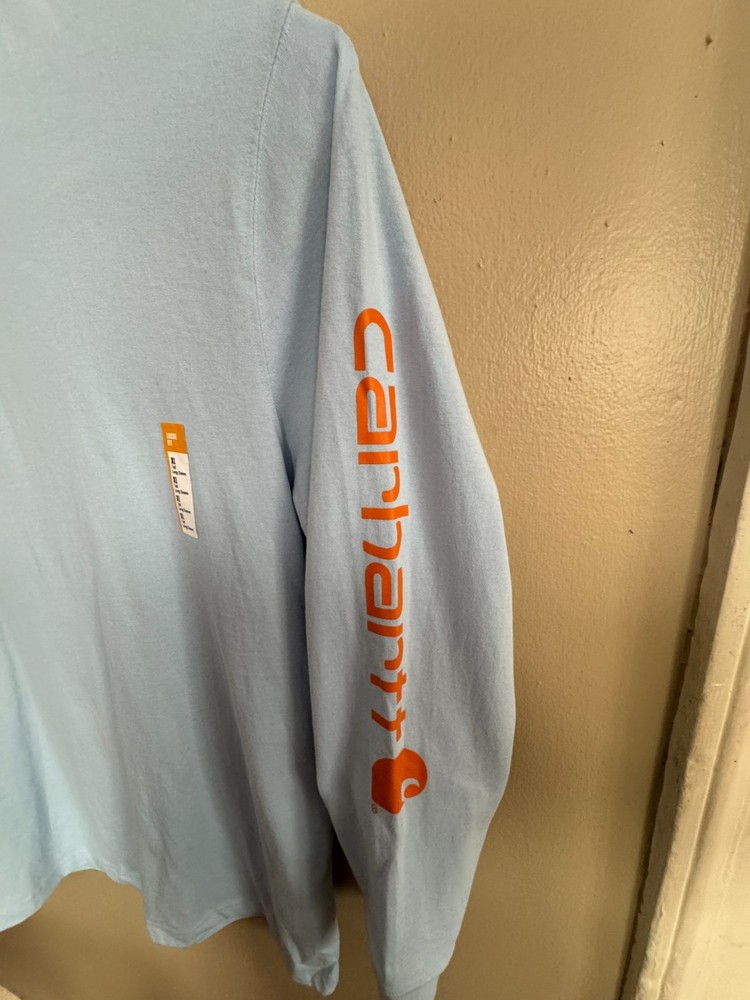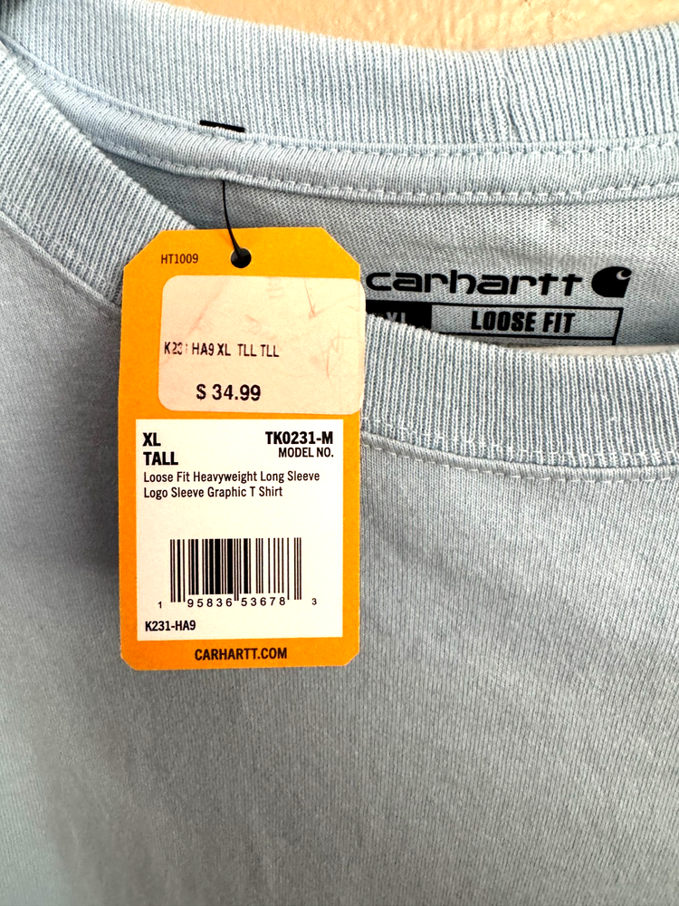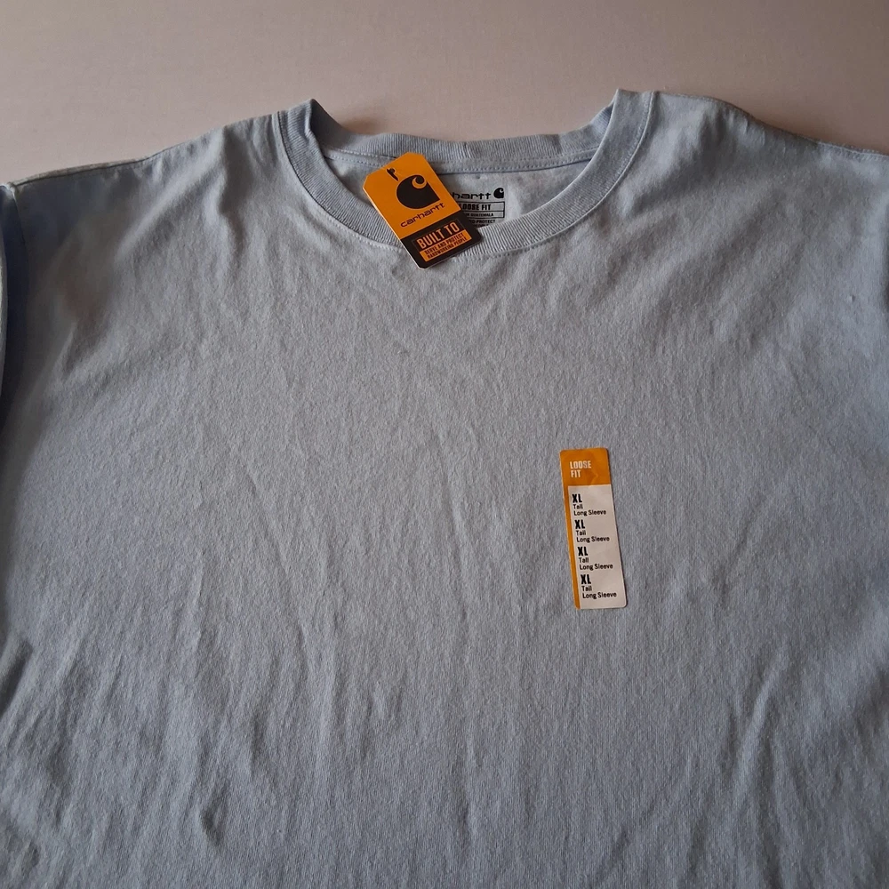 The product is a Men's Carhartt long sleeve logo graphic T-shirt in light blue, designed for big and tall size XL individuals. Made from cotton material, this regular fit T-shirt features a crew neck and is machine washable for easy care. The vintage design includes a logo accent, making it a stylish option for various seasons including winter, summer, fall, and spring. This T-shirt is a perfect addition to any man's wardrobe for both comfort and style.