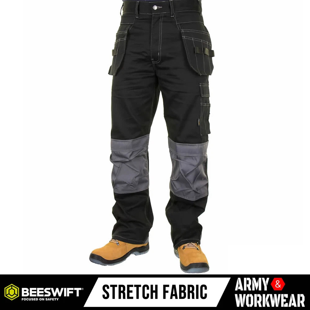 BEESWIFT KINGTON MULTI PURPOSE POCKET TROUSERS Work trousers with Cordura knee pad patch pockets Hardwearing Durable Fabric 98% cotton / 2% Lycra stretch fabric YKK Zip fastening with metal button waistband attachment 7 belt loops Triple stitching to main seams 2 front hip pockets 2 detachable tool (nail) pouches 1 multi cargo pocket to thigh, velcro fastening, including mobile phone pocket 2 rear patch pockets with velcro fastening Cordura knee pad pockets 1 Cordura rule pockets Cordura heel reinforcement 28 to 48 inch waist Regular Leg Tall Leg BEESWIFT KINGTON MULTI PURPOSE POCKET TROUSERS Work trousers with Cordura knee pad patch pockets Hardwearing Durable Fabric 98% cotton / 2% Lycra stretch fabric YKK Zip fastening with metal button waistband attachment 7 belt loops Triple stitching to main seams 2 front hip pockets 2 detachable tool (nail) pouches 1 multi cargo pocket to thigh, velcro fastening, including mobile phone pocket 2 rear patch pockets with velcro fastening Cordura knee pad pockets 1 Cordura rule pockets Cordura heel reinforcement 28 to 48 inch waist Regular Leg Tall Leg BEESWIFT KINGTON MULTI PURPOSE POCKET TROUSERS Work trousers with Cordura knee pad patch pockets Hardwearing Durable Fabric 98% cotton / 2% Lycra stretch fabric YKK Zip fastening with metal button waistband attachment 7 belt loops Triple stitching to main seams 2 front hip pockets 2 detachable tool (nail) pouches 1 multi cargo pocket to thigh, velcro fastening, including mobile phone pocket 2 rear patch pockets with velcro fastening Cordura knee pad pockets 1 Cordura rule pockets Cordura heel reinforcement 28 to 48 inch waist Regular Leg Tall Leg