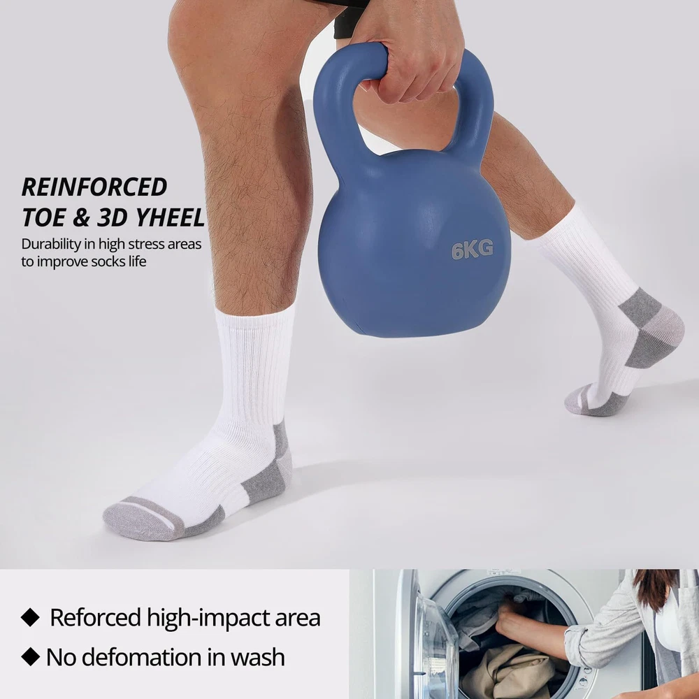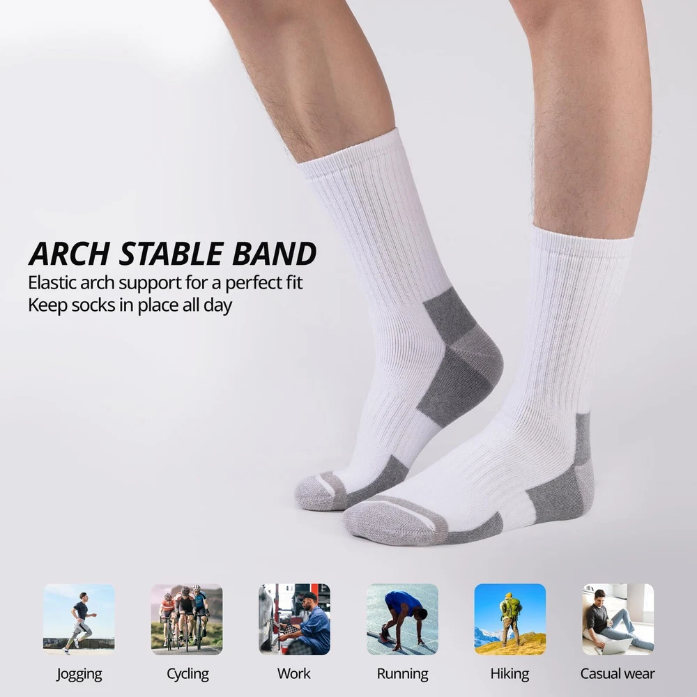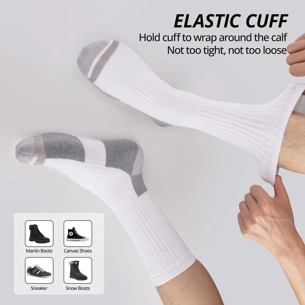 [COMFORT COTTON CREW SOCKS]: Our mens crew socks use soft recycled cotton to absorb sweat and keep feet dry during work, running and sports. These crew socks for men with polyester and spandex knitting to provide durability and retain mens socks shape even after repeated washings. Our mens athletic socks fit US men's shoe size 6-12, mens socks size 10-13. [FULL CUSHION MENS WORK SOCKS]: These mens socks crew designed with heavy cushion for ultimate support in any work boot or athletic shoe. Socks for men add thick moisture wicking cushion to provide extra comfort, reduce friction and prevent blisters. These boot socks for men suitable for heavy duty work or daily activities. [DURABLE CREW WORK SOCKS]: Our men's crew socks have reinforced toe and heel to enhance work socks durability in high stress areas and increase the life of socks. These cotton crew socks for men suitable for all seasons. Work socks for steel toe boots is a great present for men. [GREAT ELASTICITY-ARCH SUPPORT]: These athletic crew socks men with elastic rubber bands in the leg and feet arch areas to make crew socks fit and comfortably against your calf. [BEST CUSTOMER SERVICE]: There are white crew socks, black crew socks and grey crew socks. Please buy our mens socks confidently! If you have any questions, please contact us. We will respond within 24 hours and solve your problem.